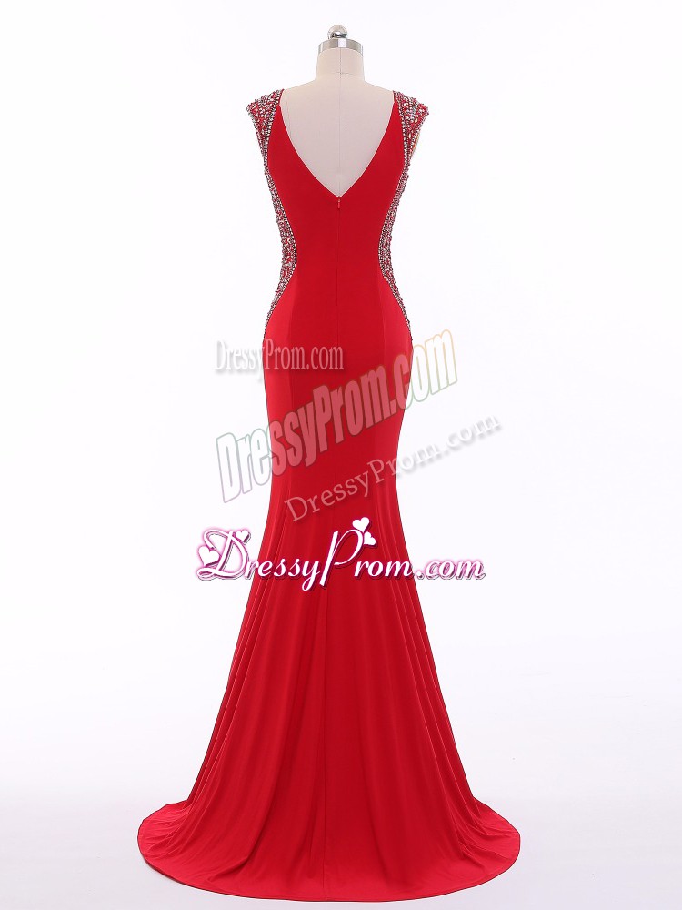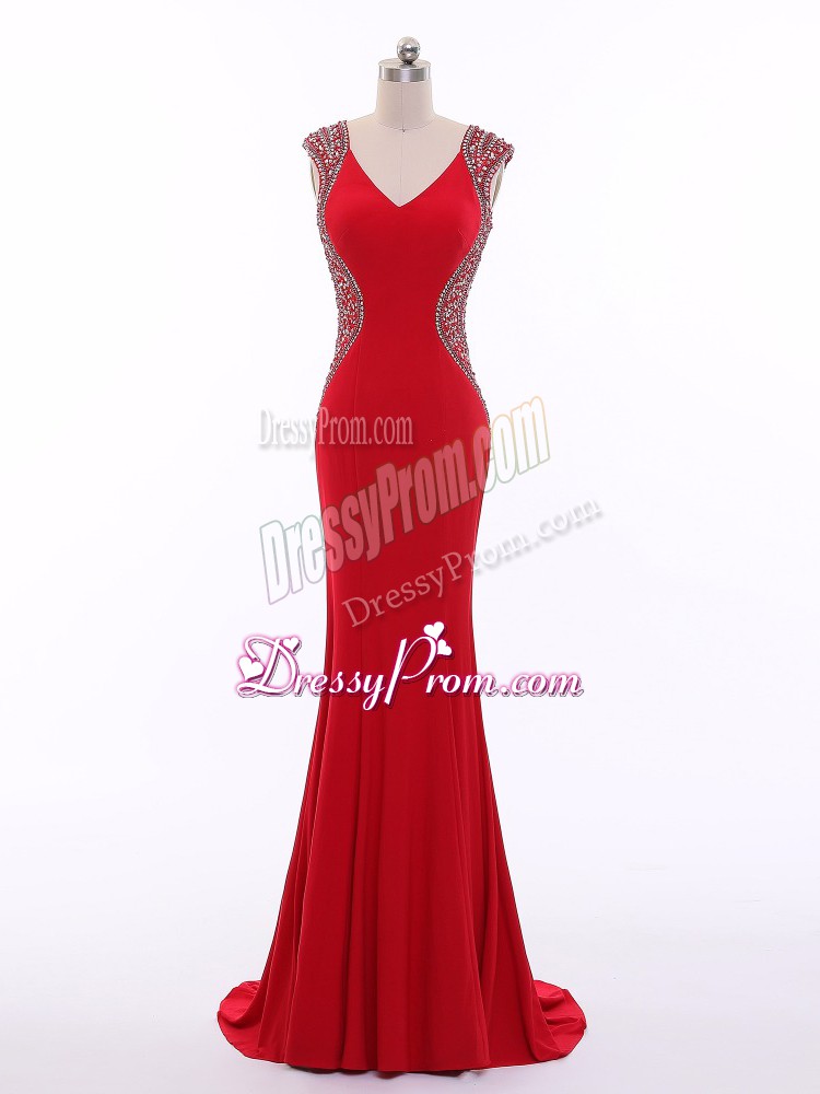 Neckline : V-neckShown Color : RedSilhouette : Column/SheathSleeve Length : sleevelessBack Detail : ZipperFabric : ChiffonEmbellishment : BeadingOccasion : Prom,Military BallSeason : Spring,Summer,Fall,Winter