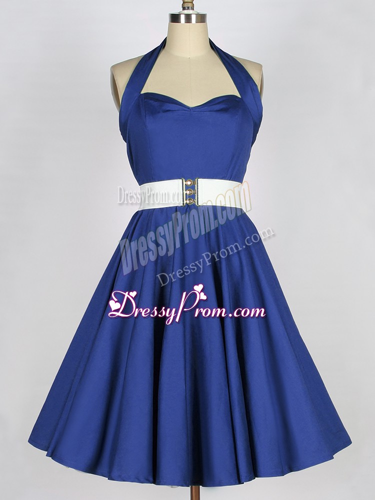 Neckline : Halter top Shown Color : Blue Silhouette : A-line Sleeve Length : sleeveless Hemline : knee length Back Detail : Lace up Fabric : Taffeta Embellishment : Belt Occasion : Prom,Party,Wedding Party Season : Spring,Summer,Fall