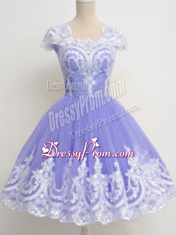 Neckline : SquareShown Color : LavenderSilhouette : A-lineSleeve Length : cap sleevesHemline : knee lengthBack Detail : ZipperFabric : TulleEmbellishment : LaceOccasion : Prom,Party,Wedding PartySeason : Spring,Summer,Fall
