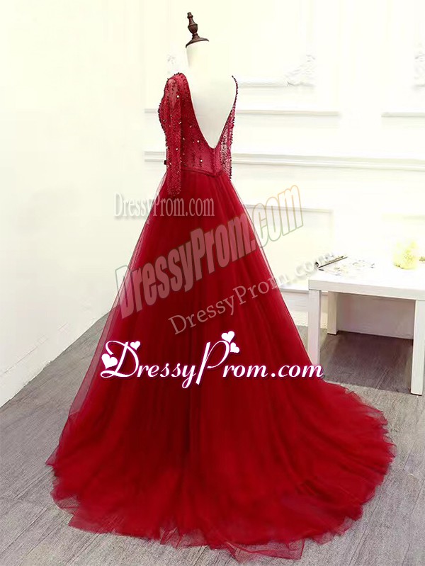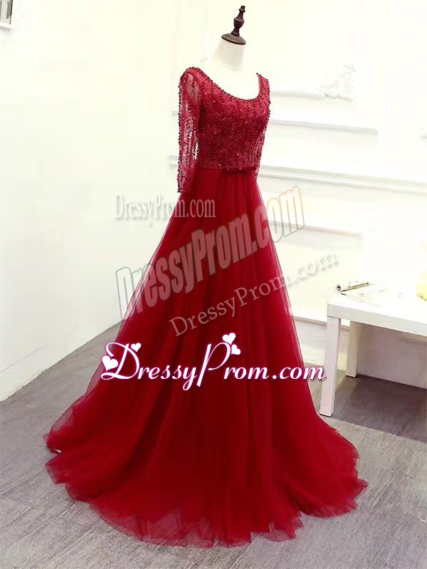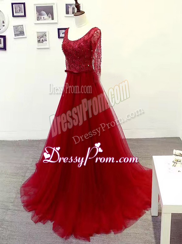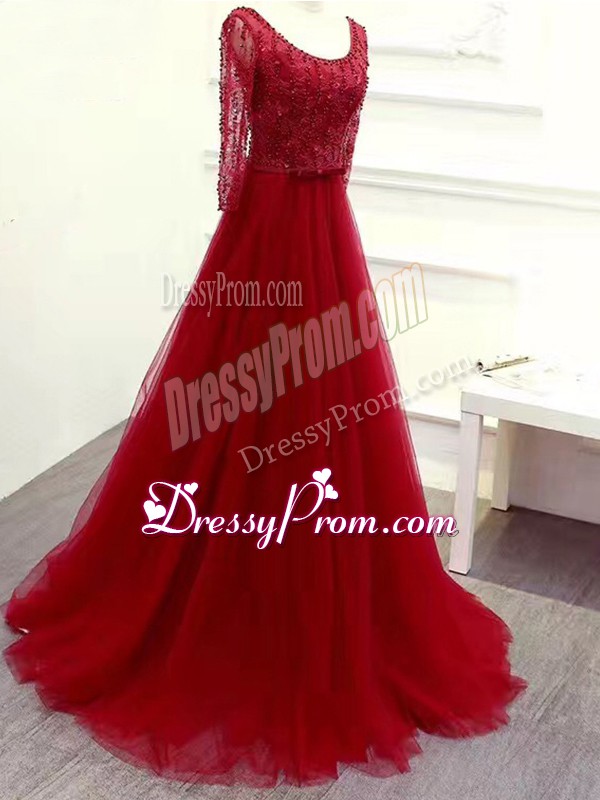 Neckline : ScoopShown Color : Wine RedSilhouette : EmpireSleeve Length : long sleevesBack Detail : ZipperFabric : TulleEmbellishment : Beading,Lace,BeltOccasion : Prom,PartySeason : Spring,Summer,Fall,Winter