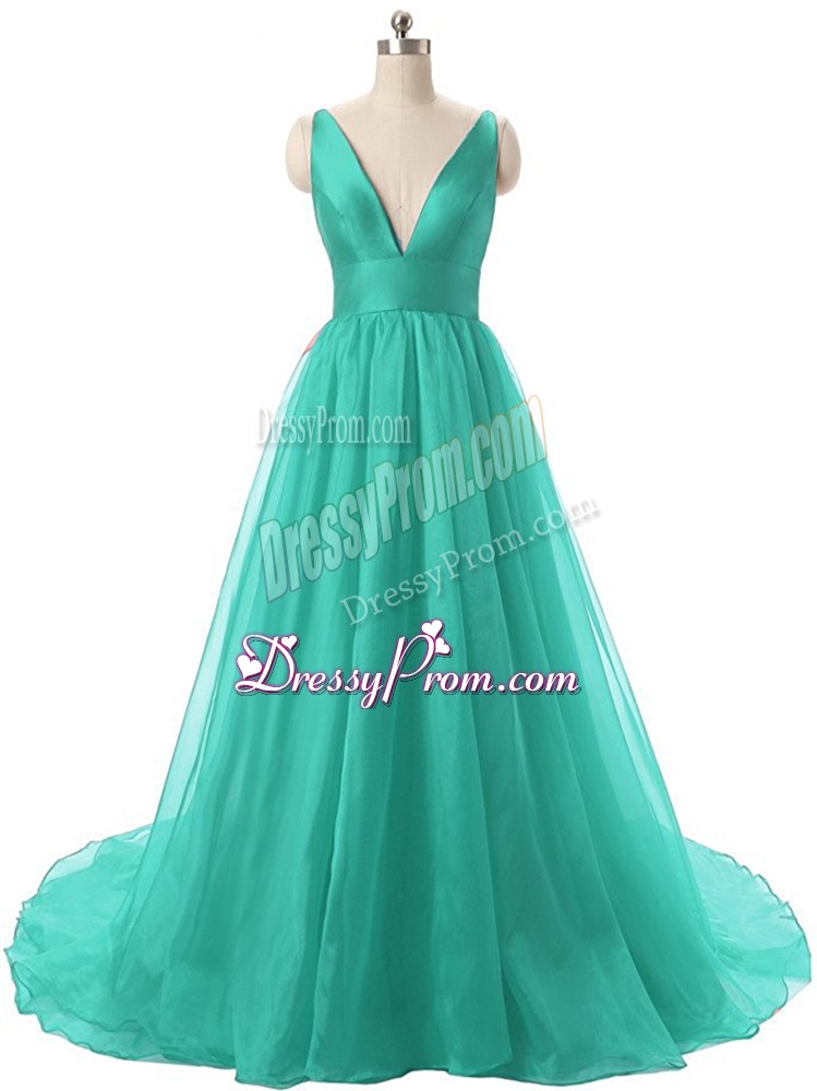 Neckline : V-neckShown Color : TurquoiseSilhouette : A-lineSleeve Length : sleevelessBack Detail : BacklessFabric : OrganzaEmbellishment : RuchingOccasion : Prom,Party,Military BallSeason : Spring,Summer,Fall,Winter