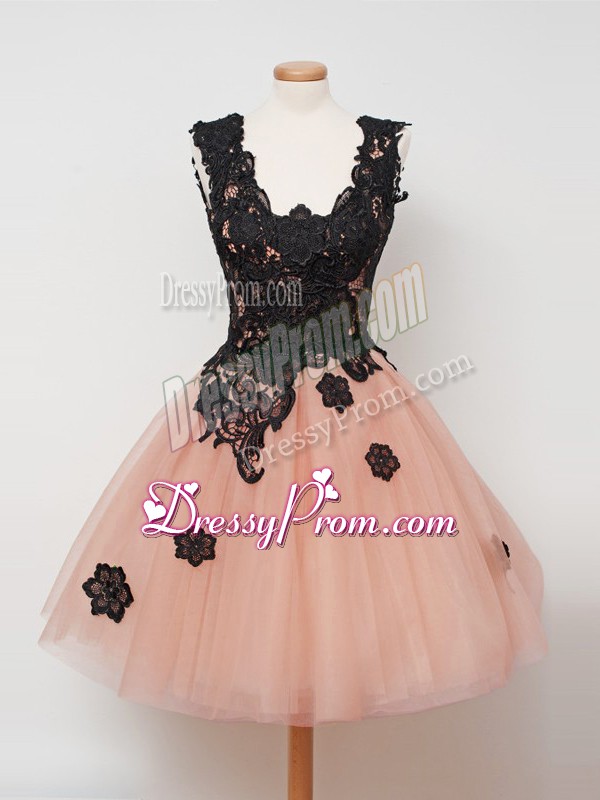 Neckline : StrapsShown Color : PeachSilhouette : Ball GownsSleeve Length : sleevelessHemline : knee lengthBack Detail : ZipperFabric : TulleEmbellishment : LaceOccasion : Prom,Party,Wedding PartySeason : Spring,Summer,Fall