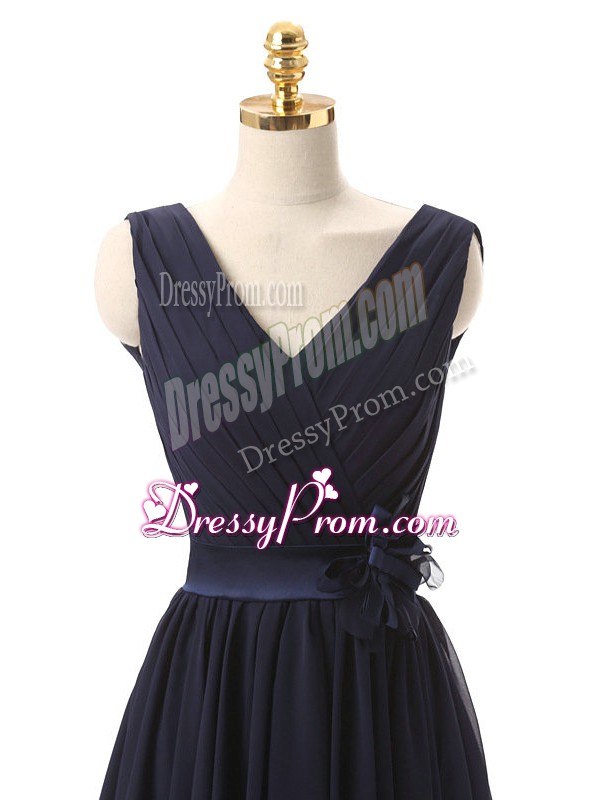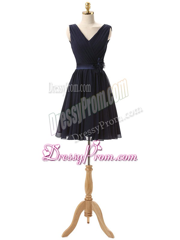 Neckline : V-neck Shown Color : Navy Blue Silhouette : A-line Sleeve Length : sleeveless Hemline : mini length Back Detail : Lace up Fabric : Chiffon Embellishment : Hand Made Flower Occasion : Prom,Party,Wedding Party Season : Spring,Summer,Fall