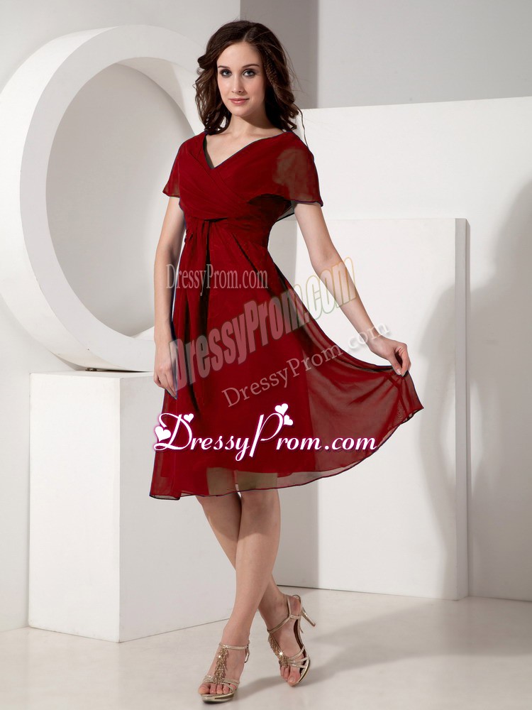 Neckline : V-neckShown Color : RedSilhouette : EmpireSleeve Length : short sleevesHemline : knee lengthBack Detail : ZipperFabric : ChiffonEmbellishment : RuchingOccasion : Prom,PartySeason : Spring,Summer,Fall