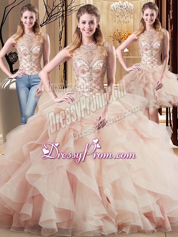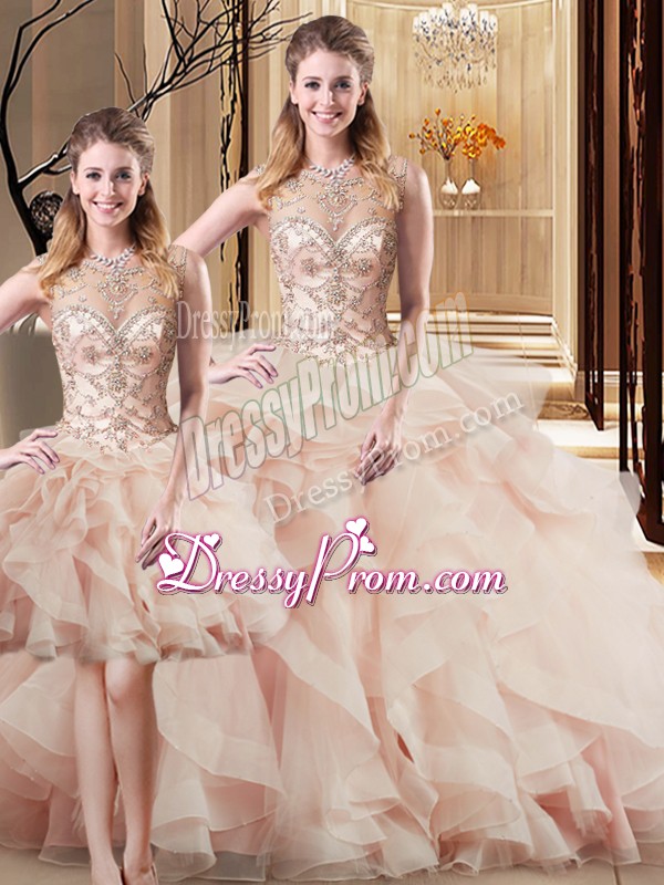 Neckline : ScoopShown Color : PeachSilhouette : Three PiecesSleeve Length : sleevelessBack Detail : Lace upFabric : TulleEmbellishment : Beading,RufflesOccasion : Military Ball,Sweet 16,QuinceaneraSeason : Spring,Summer,Fall,Winter