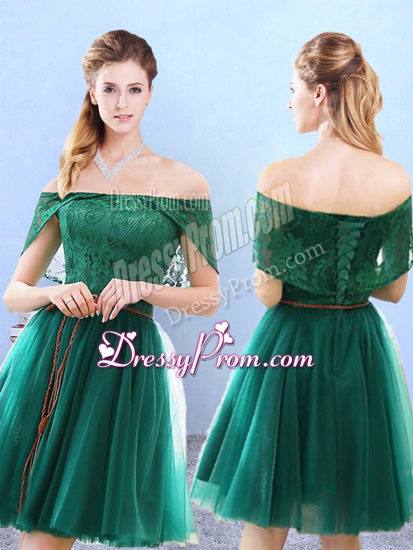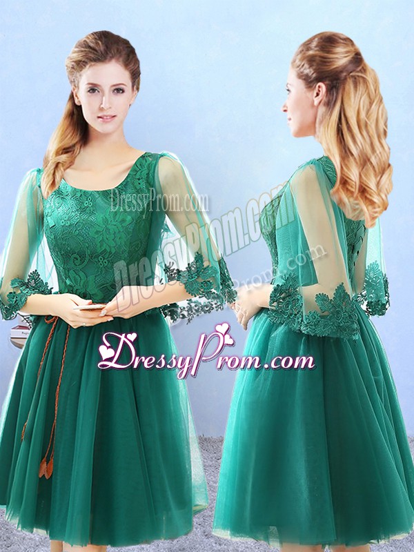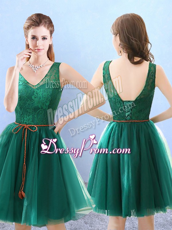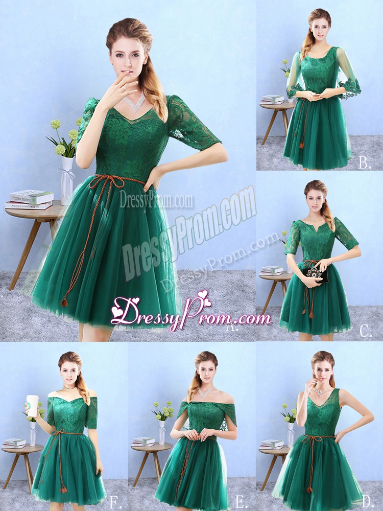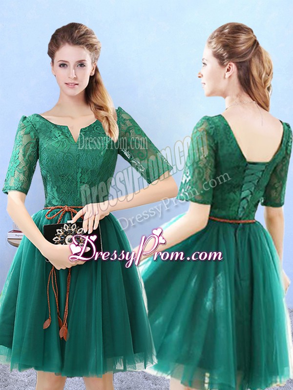 Neckline : V-neckShown Color : GreenSilhouette : A-lineSleeve Length : half sleevesHemline : knee lengthBack Detail : BacklessFabric : TulleEmbellishment : LaceOccasion : Prom,PartySeason : Spring,Summer,Fall