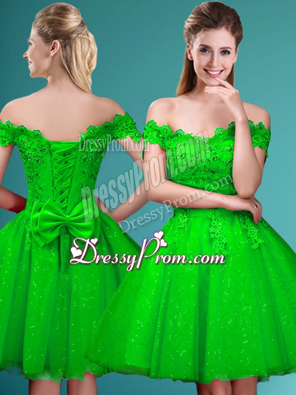 Neckline : Off the shoulder Shown Color : Spring Green Silhouette : A-line Sleeve Length : cap sleeves Hemline : knee length Back Detail : Lace up Fabric : Tulle Embellishment : Lace,Belt Occasion : Prom,Party Season : Spring,Summer,Fall