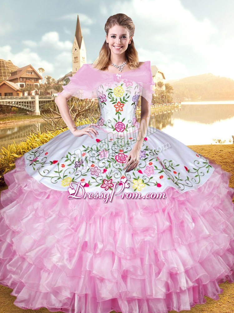 Neckline : SweetheartShown Color : Rose Pink Silhouette : Ball GownsSleeve Length : sleevelessHemline : floor lengthBack Detail : Lace upFabric : OrganzaEmbellishment : Embroidery,Ruffled LayersOccasion : Military Ball,Sweet 16,QuinceaneraSeason : Spring,Summer,Fall,Winter