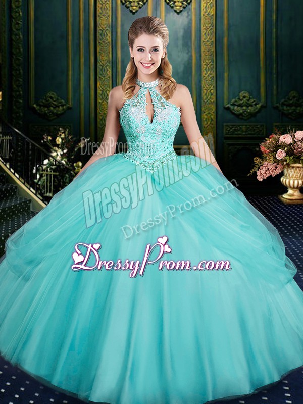 Neckline : Halter topShown Color : Aqua BlueSilhouette : Ball GownsSleeve Length : sleevelessHemline : floor lengthBack Detail : Lace upFabric : TulleEmbellishment : Beading,Pick UpsOccasion : Military Ball,Sweet 16,QuinceaneraSeason : Spring,Summer,Fall,Winter