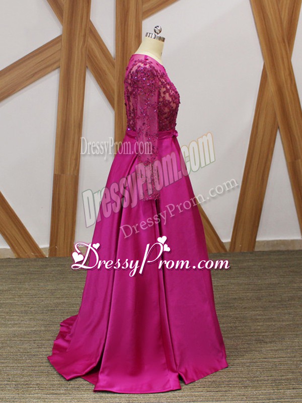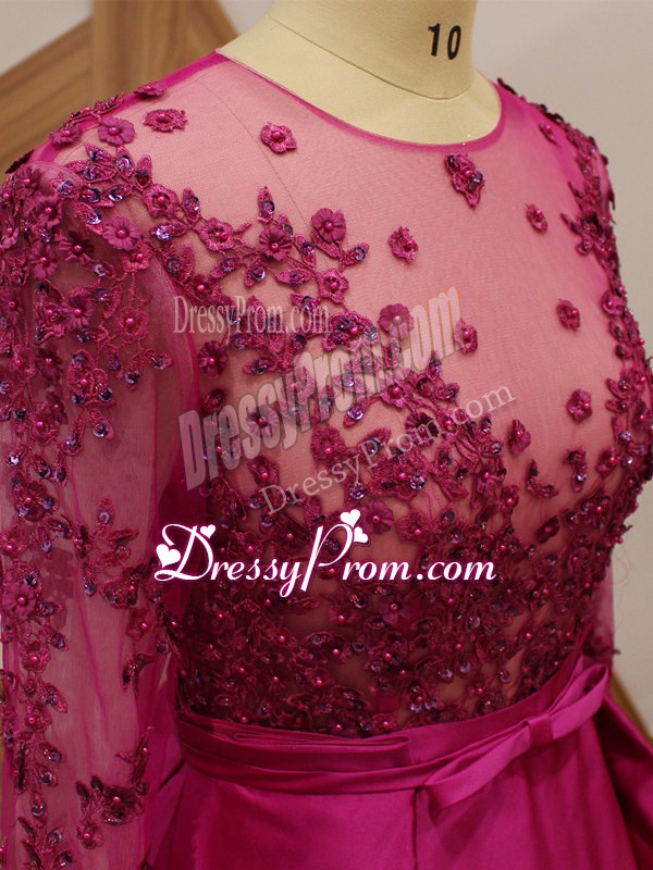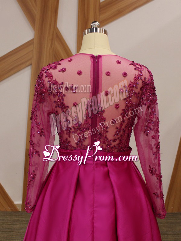 Neckline : One shoulderShown Color : FuchsiaSilhouette : EmpireSleeve Length : long sleevesHemline : floor lengthBack Detail : ZipperFabric : Elastic Woven SatinEmbellishment : Beading,Appliques,BeltOccasion : Prom,Party,Military BallSeason : Spring,Summer,Fall,Winter