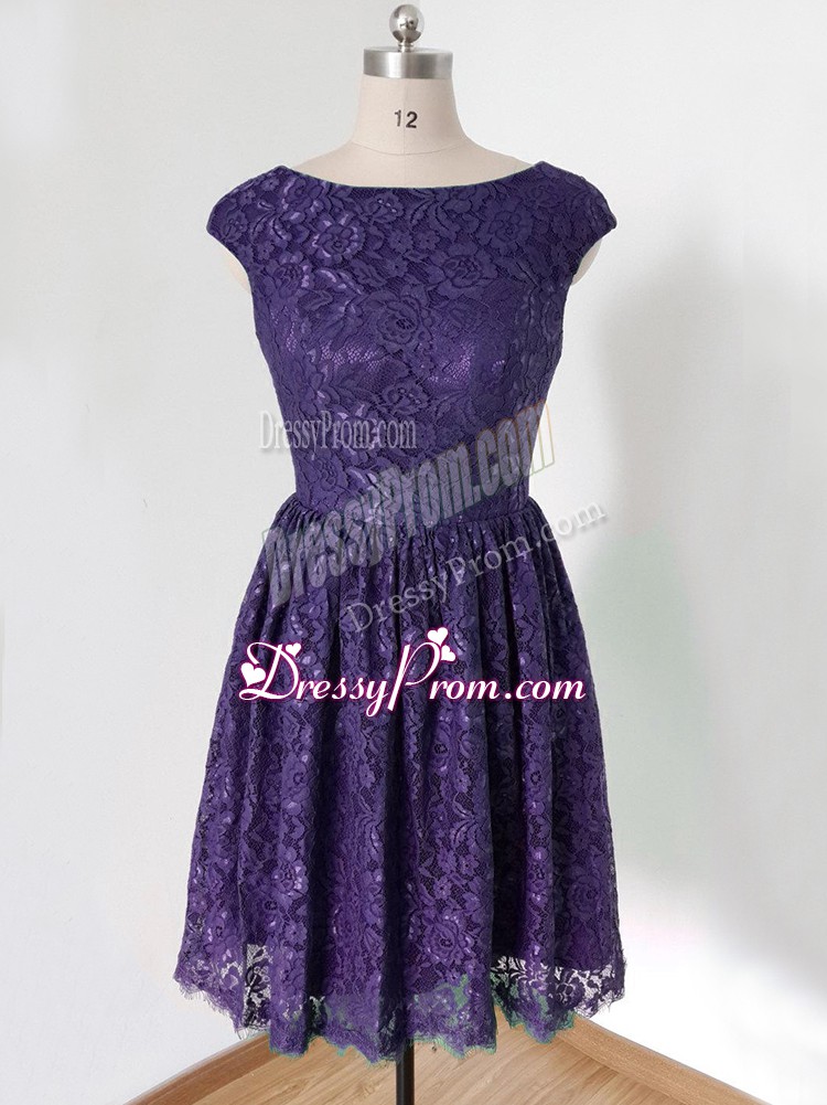 Neckline : ScoopShown Color : PurpleSilhouette : EmpireSleeve Length : cap sleevesHemline : knee lengthBack Detail : Lace upFabric : LaceEmbellishment : LaceOccasion : Prom,Party,Wedding PartySeason : Spring,Summer,Fall