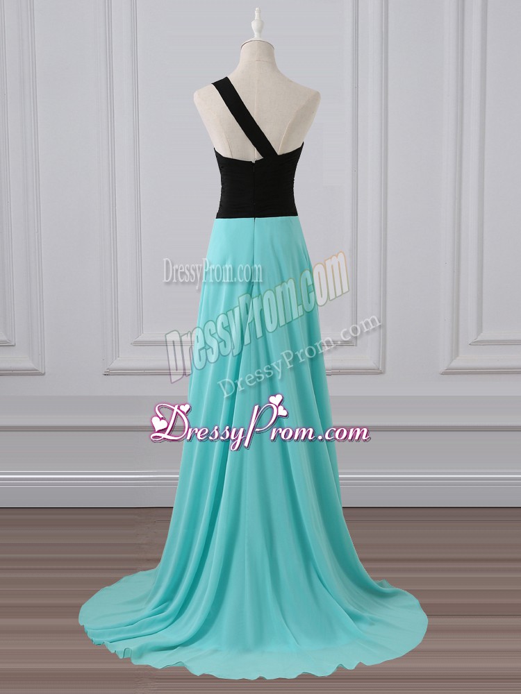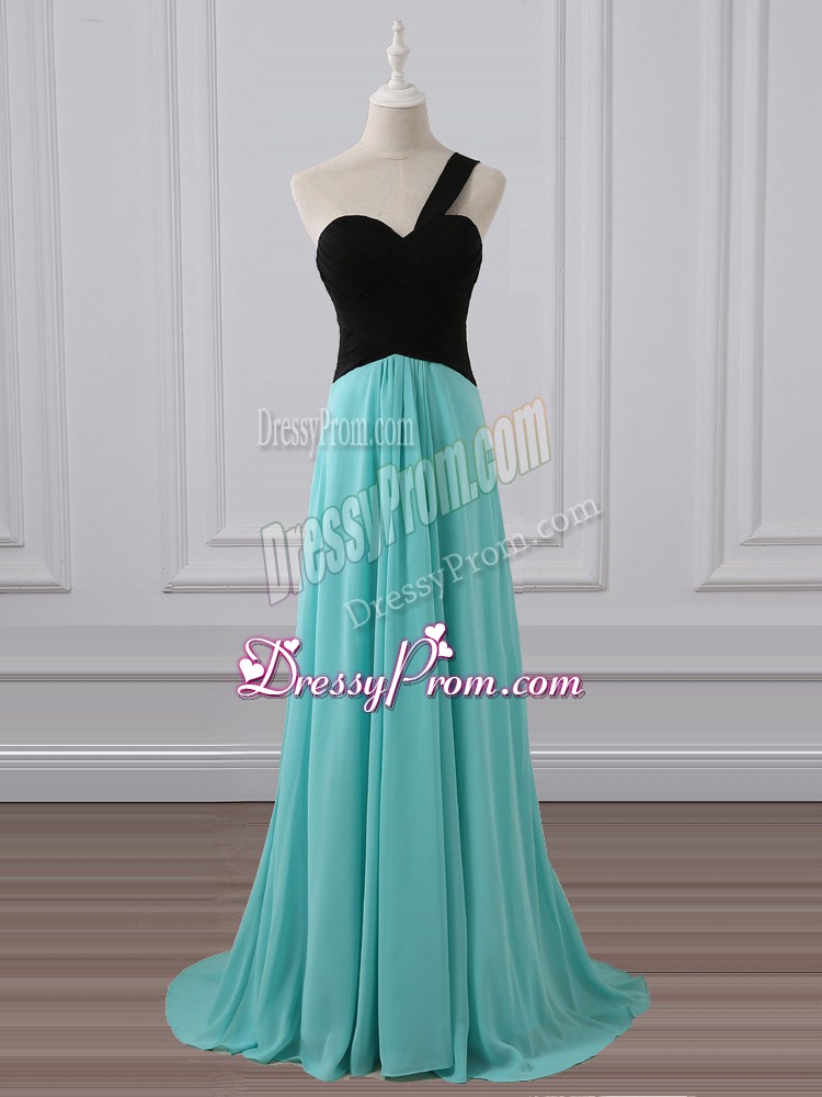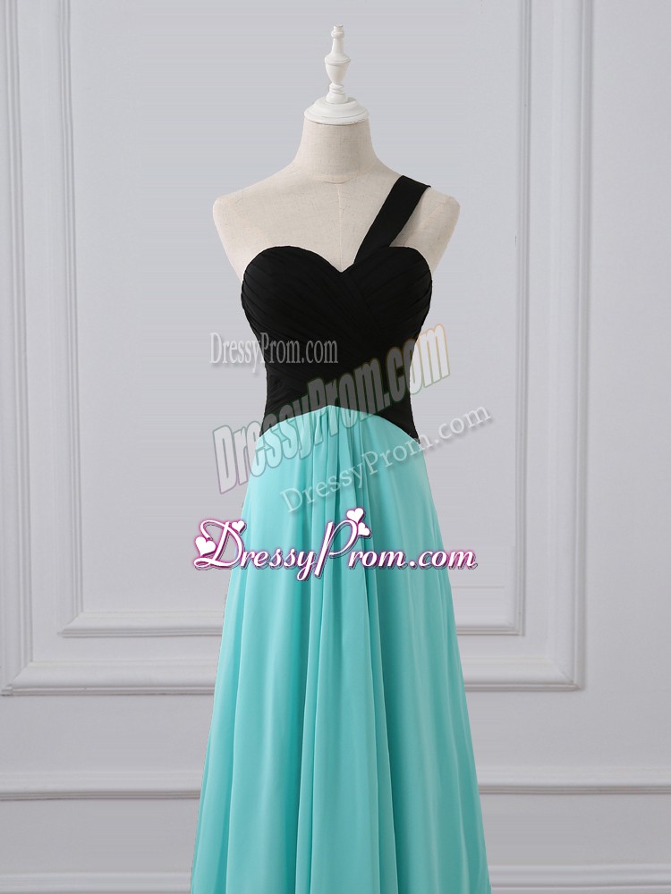 Neckline : One shoulder Shown Color : Aqua Blue Silhouette : Empire Sleeve Length : sleeveless Back Detail : Zipper Fabric : Chiffon Embellishment : Ruching Occasion : Prom,Party,Wedding Party Season : Spring,Summer,Fall,Winter