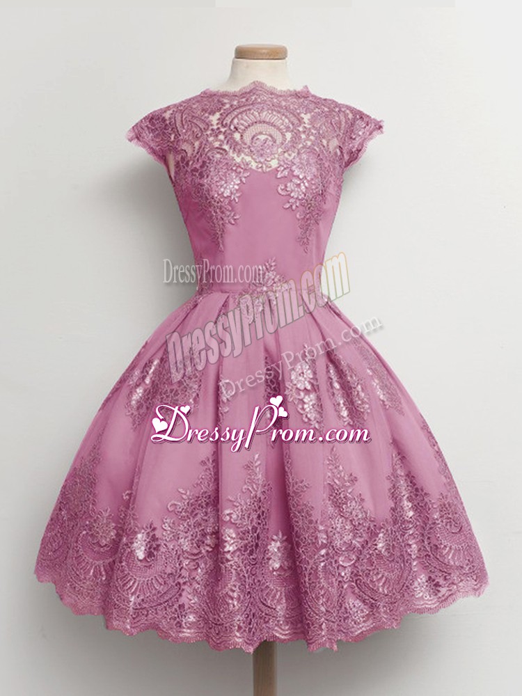 Neckline : ScallopedShown Color : LilacSilhouette : A-lineSleeve Length : cap sleevesHemline : knee lengthBack Detail : Lace upFabric : TulleEmbellishment : LaceOccasion : Prom,Party,Wedding PartySeason : Spring,Summer,Fall