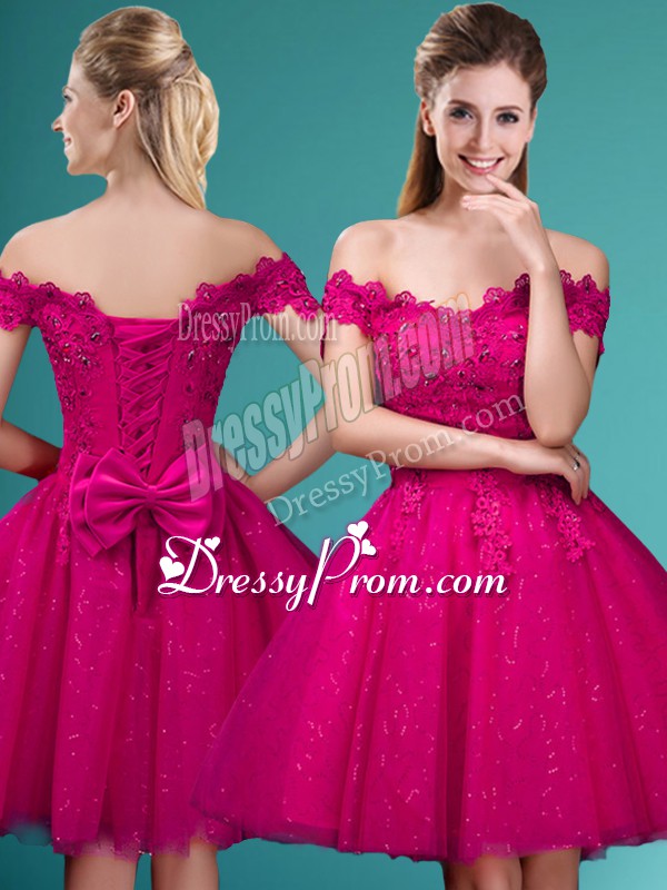 Neckline : Off the shoulderShown Color : FuchsiaSilhouette : A-lineSleeve Length : cap sleevesHemline : knee lengthBack Detail : Lace upFabric : TulleEmbellishment : Lace,BeltOccasion : Prom,PartySeason : Spring,Summer,Fall