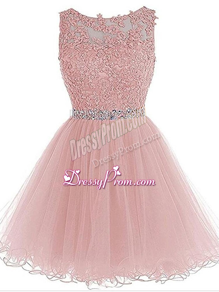 Neckline : ScoopShown Color : Pink Silhouette : A-lineSleeve Length : sleevelessHemline : mini lengthBack Detail : ZipperFabric : OrganzaEmbellishment : Beading,Lace,AppliquesOccasion : Prom,Party,Sweet 16Season : Spring,Summer,Fall