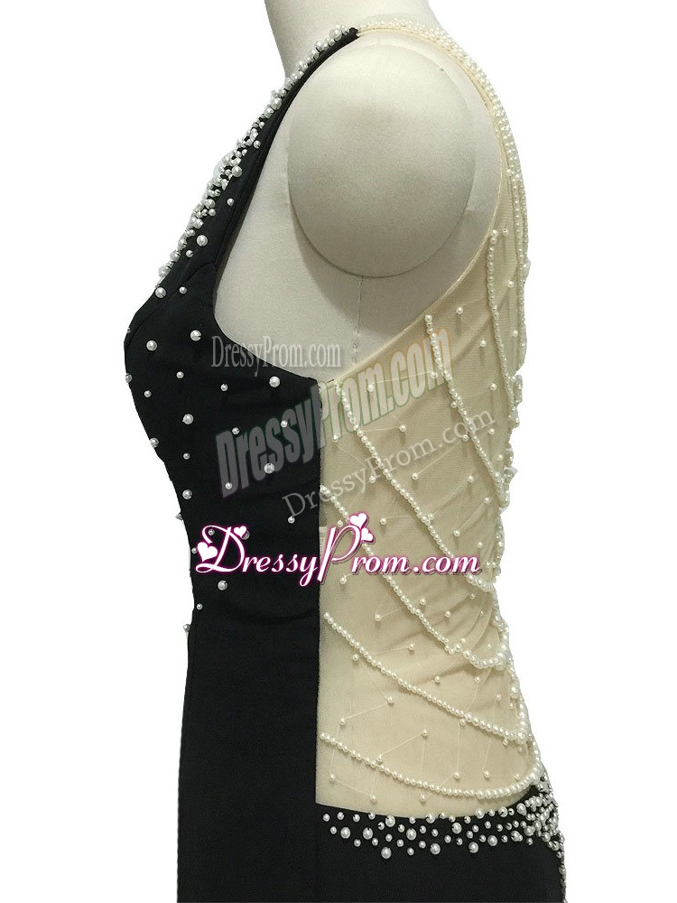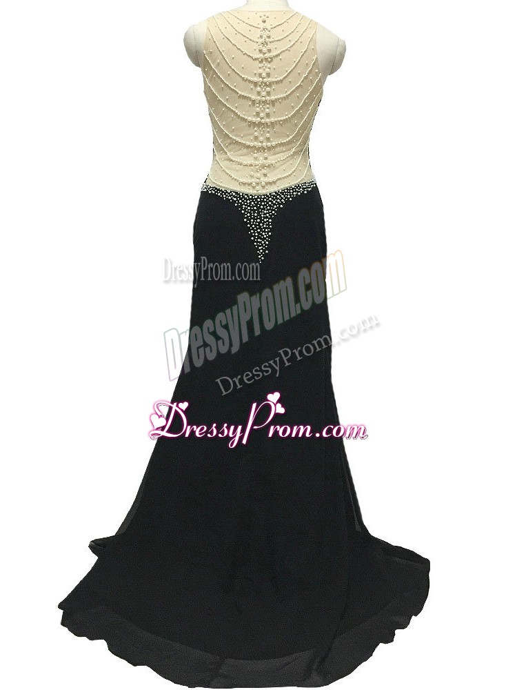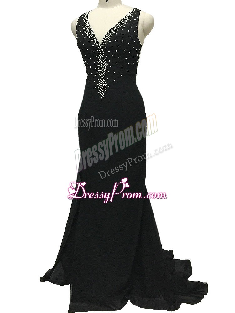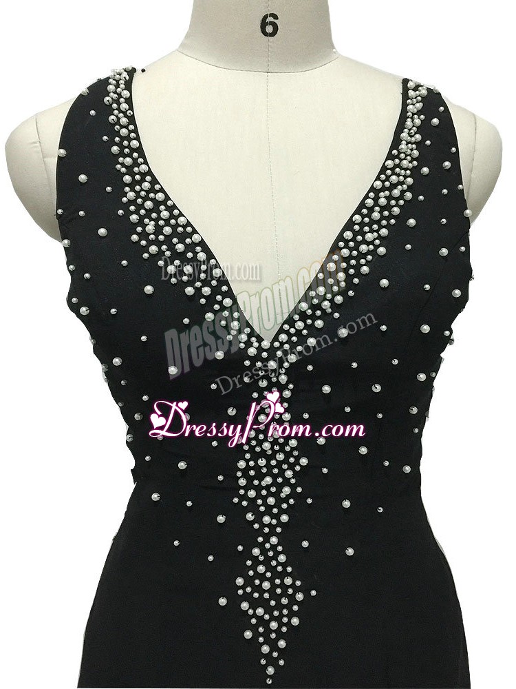 Neckline : V-neckShown Color : BlackSilhouette : Column/SheathSleeve Length : sleevelessBack Detail : Side zipperFabric : ChiffonEmbellishment : BeadingOccasion : Prom,Military Ball,Sweet 16Season : Spring,Summer,Fall,Winter