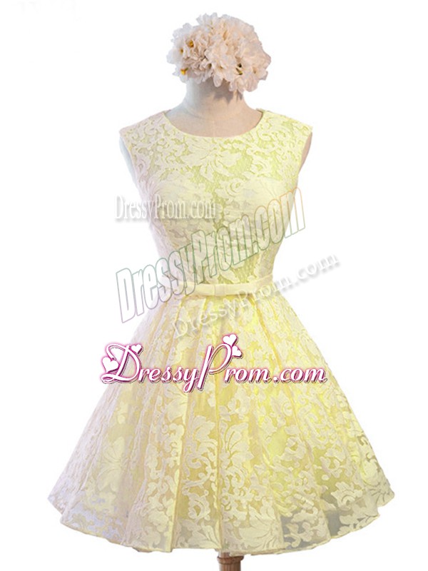 Neckline : ScoopShown Color : YellowSilhouette : A-lineSleeve Length : sleevelessHemline : knee lengthBack Detail : Lace upFabric : LaceEmbellishment : BeltOccasion : Prom,Party,Wedding PartySeason : Spring,Summer,Fall