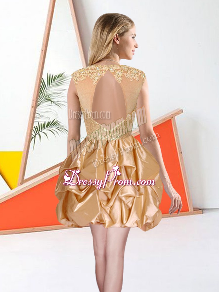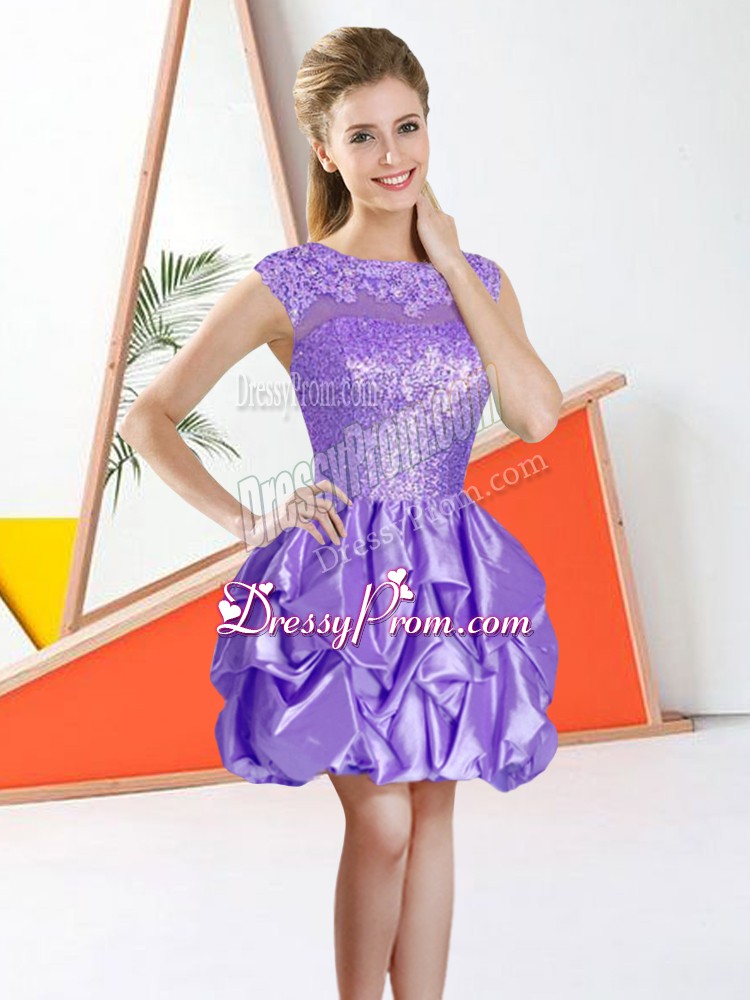 Neckline : BateauShown Color : LavenderSilhouette : Ball GownsSleeve Length : sleevelessHemline : knee lengthBack Detail : BacklessFabric : TaffetaEmbellishment : Beading,Lace,RufflesOccasion : Prom,PartySeason : Spring,Summer,Fall