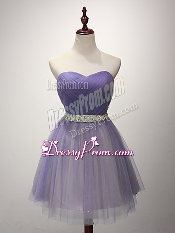 Neckline : SweetheartShown Color : LavenderSilhouette : A-lineSleeve Length : sleevelessHemline : mini lengthBack Detail : Lace upFabric : TulleEmbellishment : Beading,RuchingOccasion : Prom,Party,Sweet 16Season : Spring,Summer,Fall