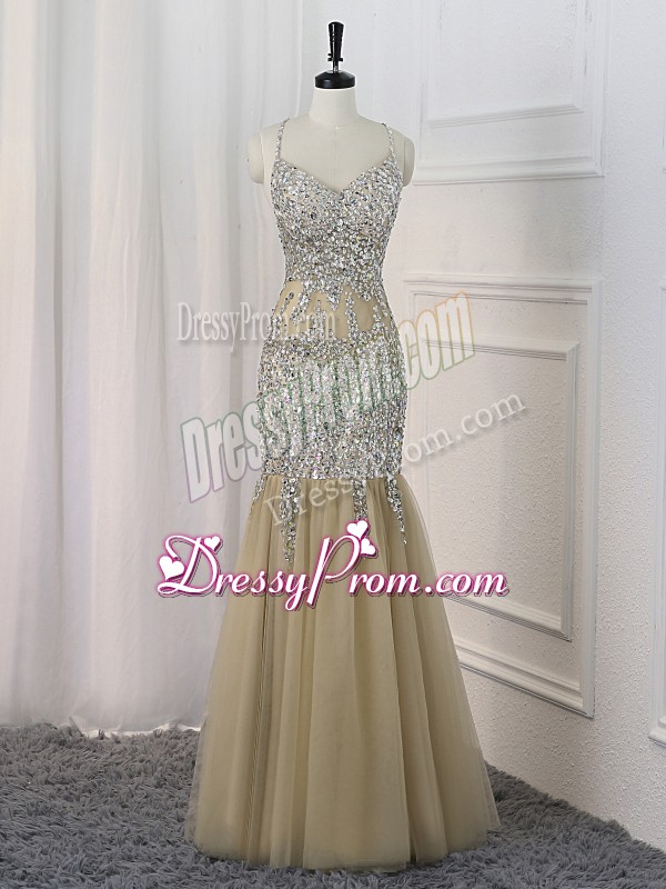Neckline : StrapsShown Color : ChampagneSilhouette : MermaidSleeve Length : sleevelessHemline : floor lengthBack Detail : BacklessFabric : SequinedEmbellishment : SequinsOccasion : Prom,Sweet 16Season : Spring,Summer,Fall,Winter