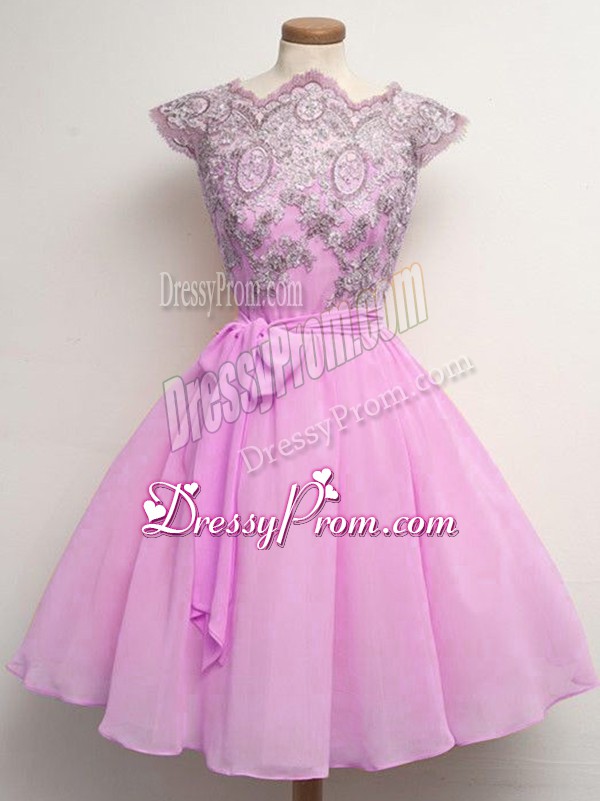 Neckline : ScallopedShown Color : LilacSilhouette : A-lineSleeve Length : cap sleevesHemline : knee lengthBack Detail : Lace upFabric : ChiffonEmbellishment : Lace,BeltOccasion : Prom,Party,Wedding PartySeason : Spring,Summer,Fall