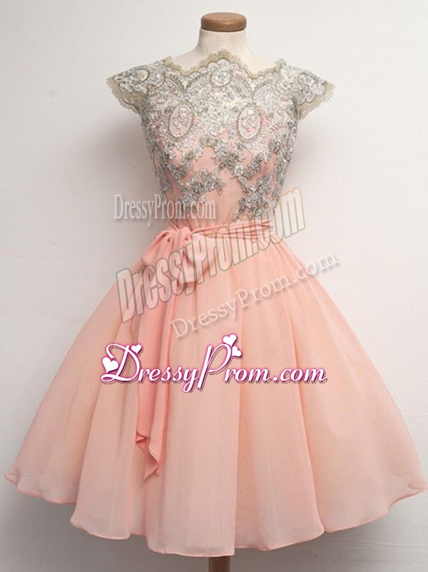 Neckline : ScallopedShown Color : PeachSilhouette : A-lineSleeve Length : cap sleevesHemline : knee lengthBack Detail : ZipperFabric : ChiffonEmbellishment : Lace,BeltOccasion : Prom,Party,Wedding PartySeason : Spring,Summer,Fall