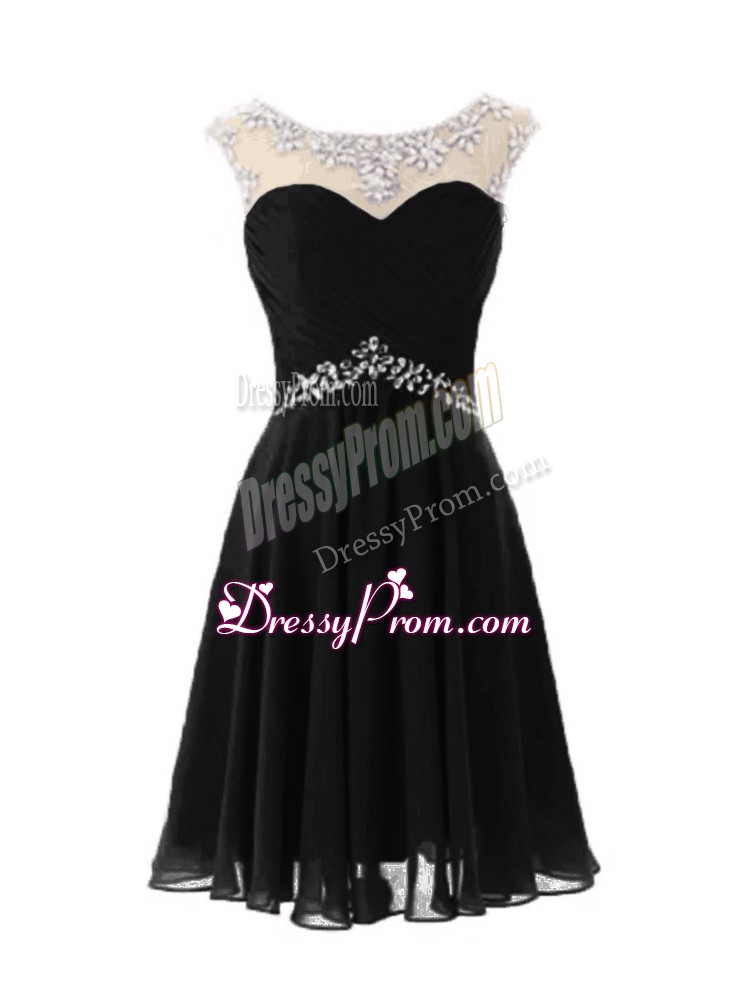 Neckline : ScoopShown Color : BlackSilhouette : A-lineSleeve Length : cap sleevesHemline : knee lengthBack Detail : ZipperFabric : ChiffonEmbellishment : BeadingOccasion : Prom,PartySeason : Spring,Summer,Fall
