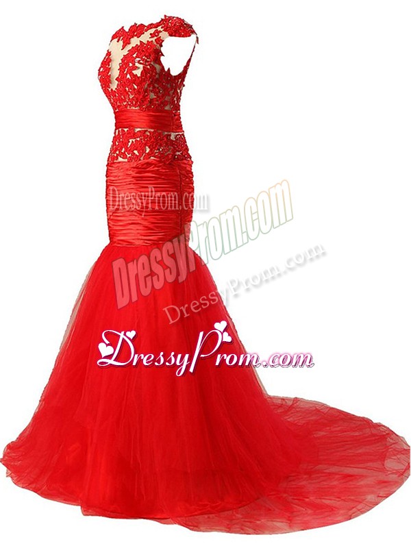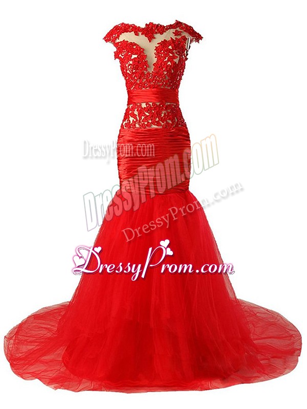 Neckline : ScoopShown Color : RedSilhouette : MermaidSleeve Length : cap sleevesBack Detail : ZipperFabric : TulleEmbellishment : Lace,Appliques,RuchingOccasion : Prom,Party,Military BallSeason : Spring,Summer,Fall,Winter