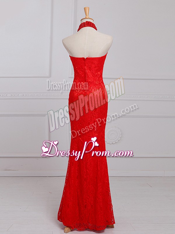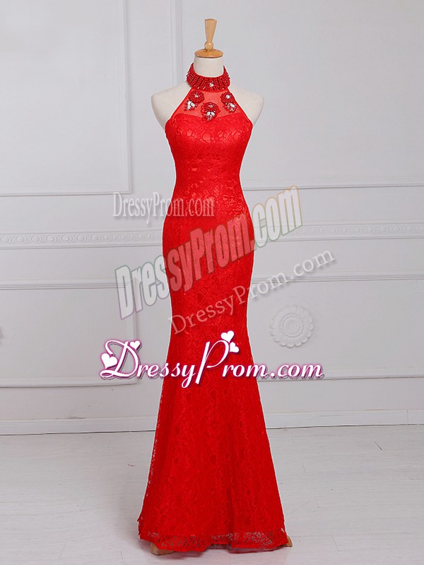 Neckline : Halter topShown Color : RedSilhouette : Column/SheathSleeve Length : sleevelessHemline : floor lengthBack Detail : ZipperFabric : LaceEmbellishment : Beading,LaceOccasion : Prom,Military Ball,Sweet 16Season : Spring,Summer,Fall,Winter