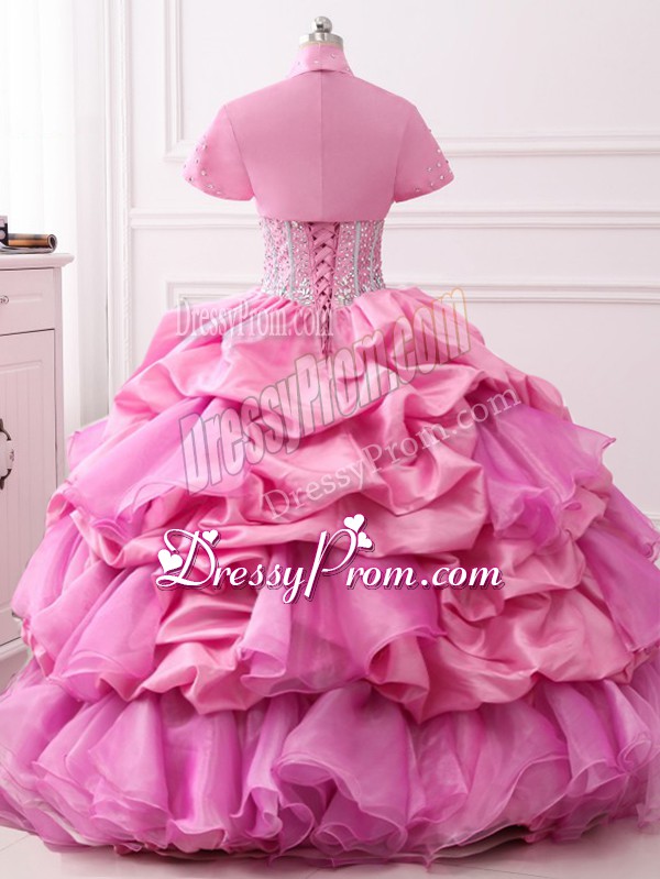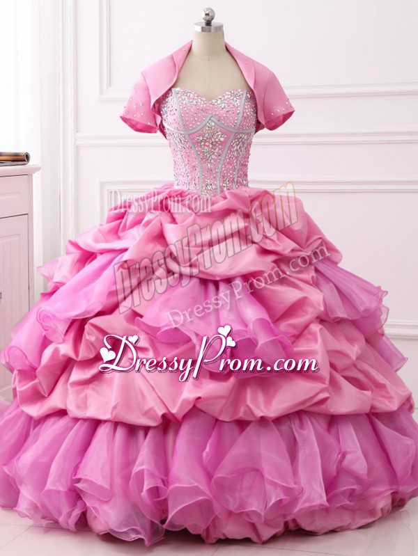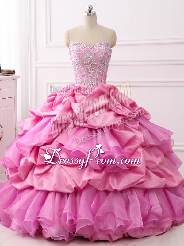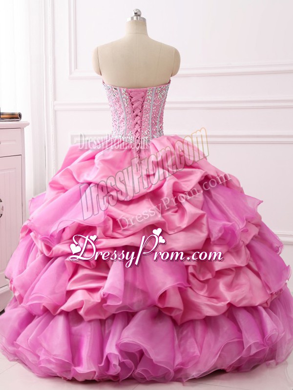Neckline : SweetheartShown Color : Rose Pink Silhouette : Ball GownsSleeve Length : sleevelessHemline : floor lengthBack Detail : Lace upFabric : Organza,TaffetaEmbellishment : Beading,Ruffles,Pick UpsOccasion : Military Ball,Sweet 16,QuinceaneraSeason : Spring,Summer,Fall,Winter