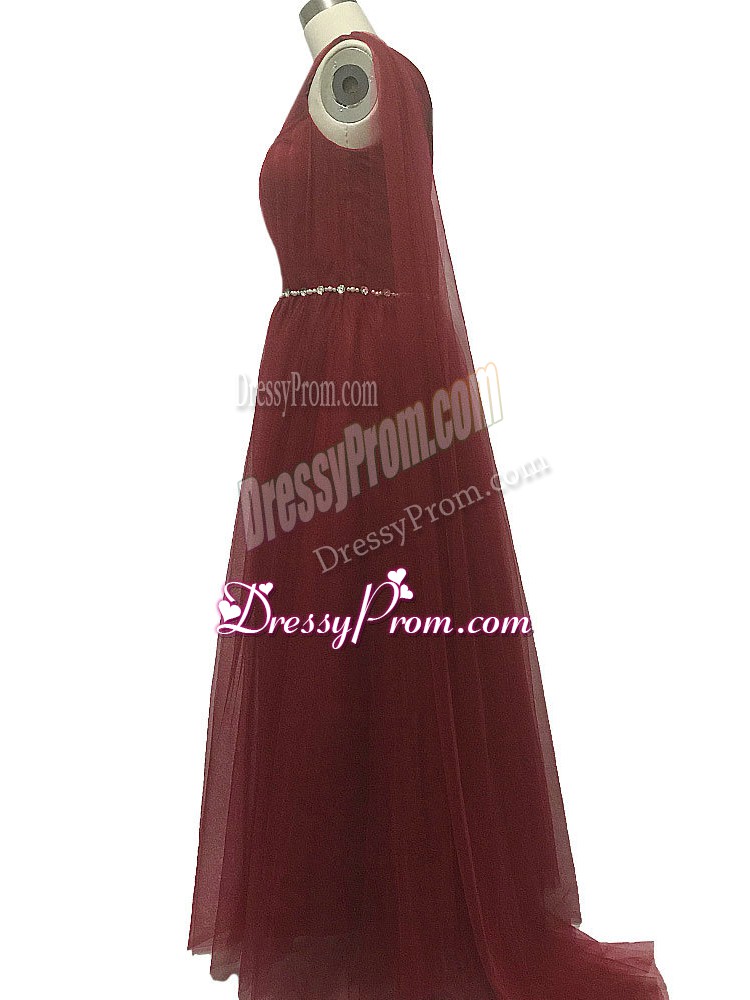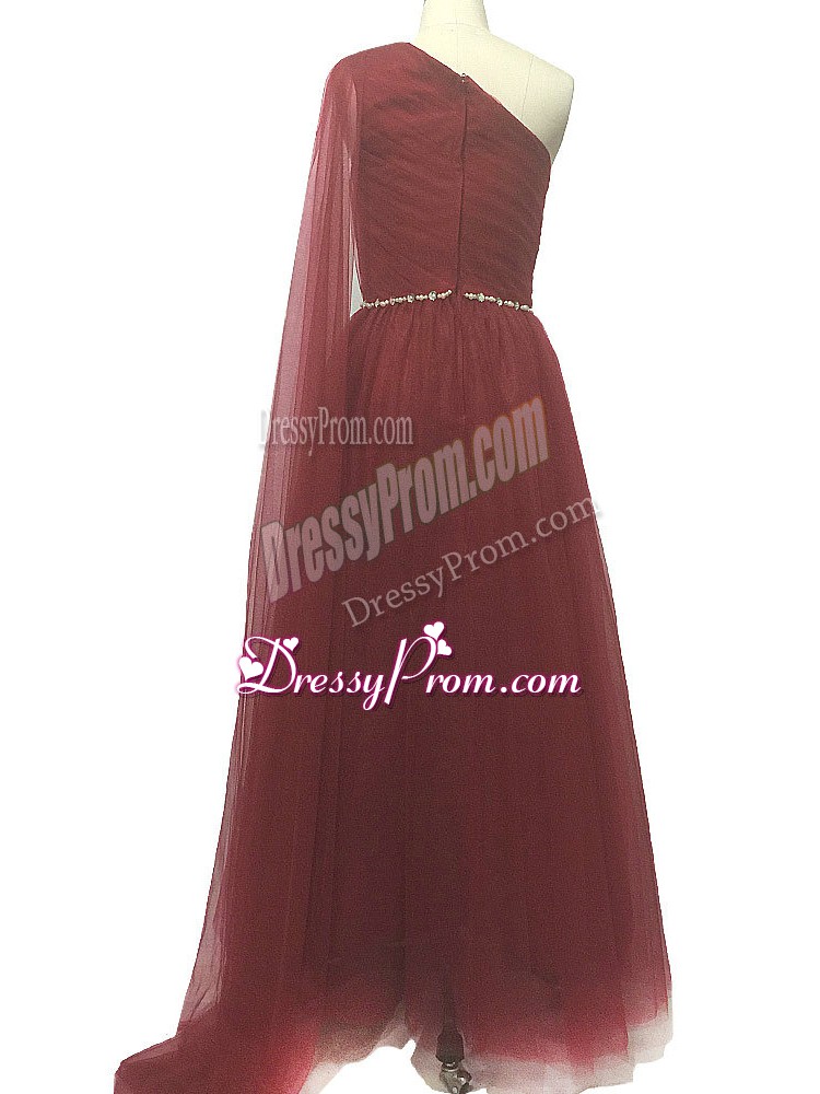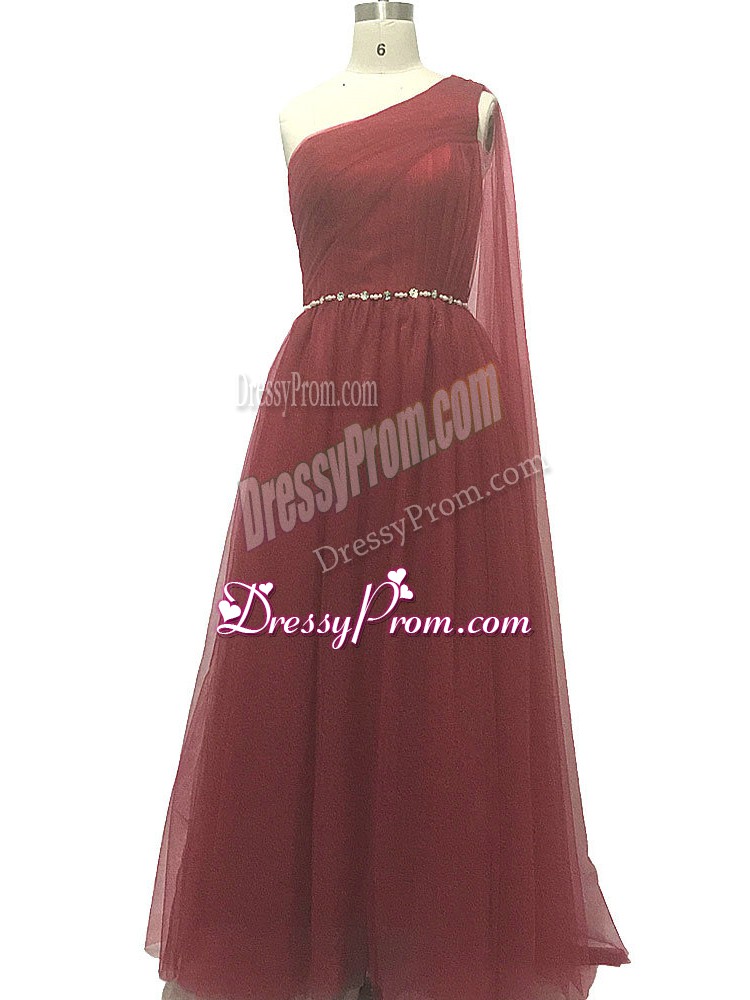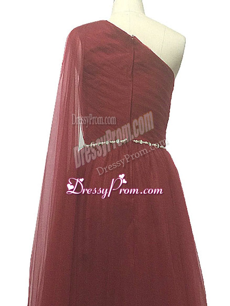 Neckline : One shoulderShown Color : BurgundySilhouette : A-lineSleeve Length : sleevelessBack Detail : ZipperFabric : ChiffonEmbellishment : Beading,PleatedOccasion : Prom,Party,Sweet 16,BeachSeason : Spring,Summer,Fall,Winter