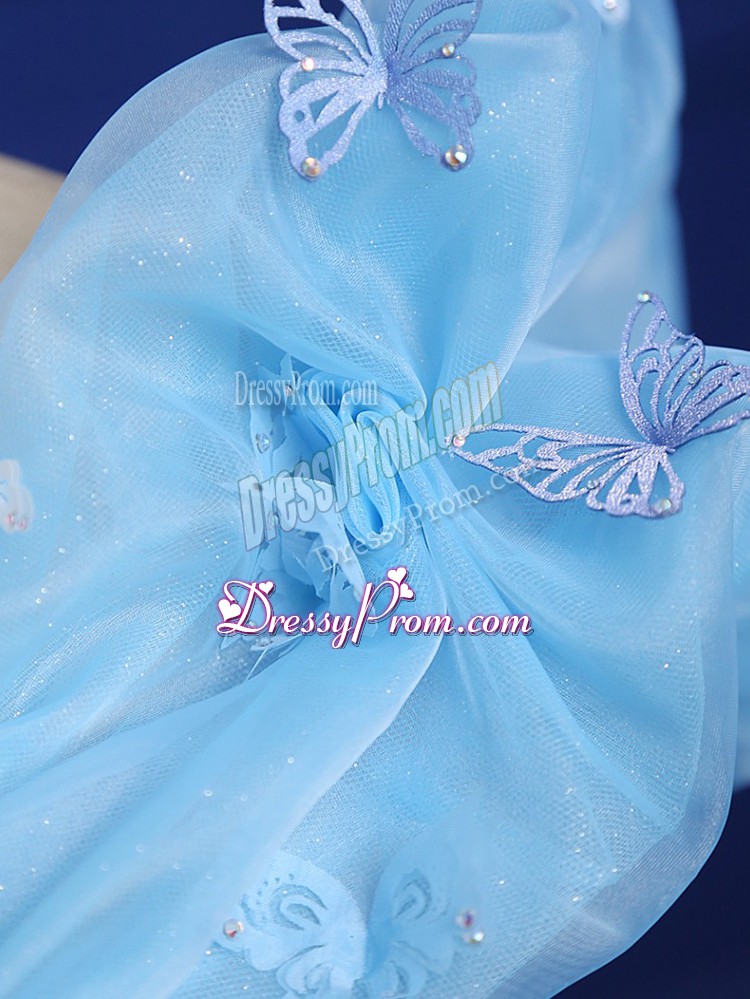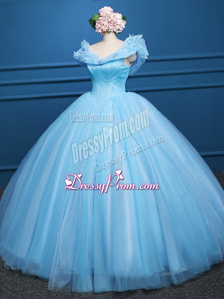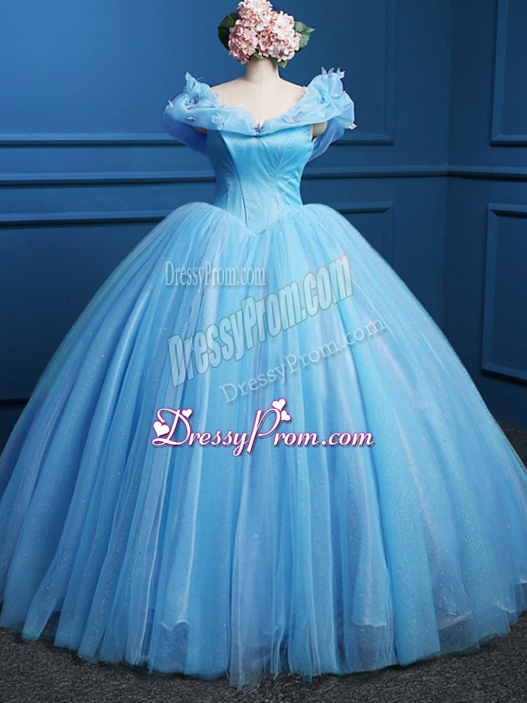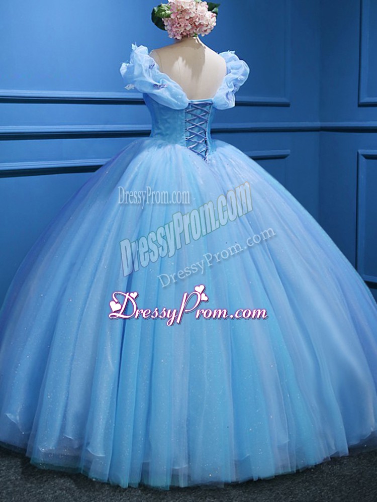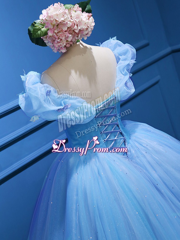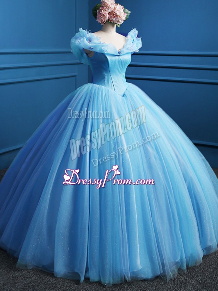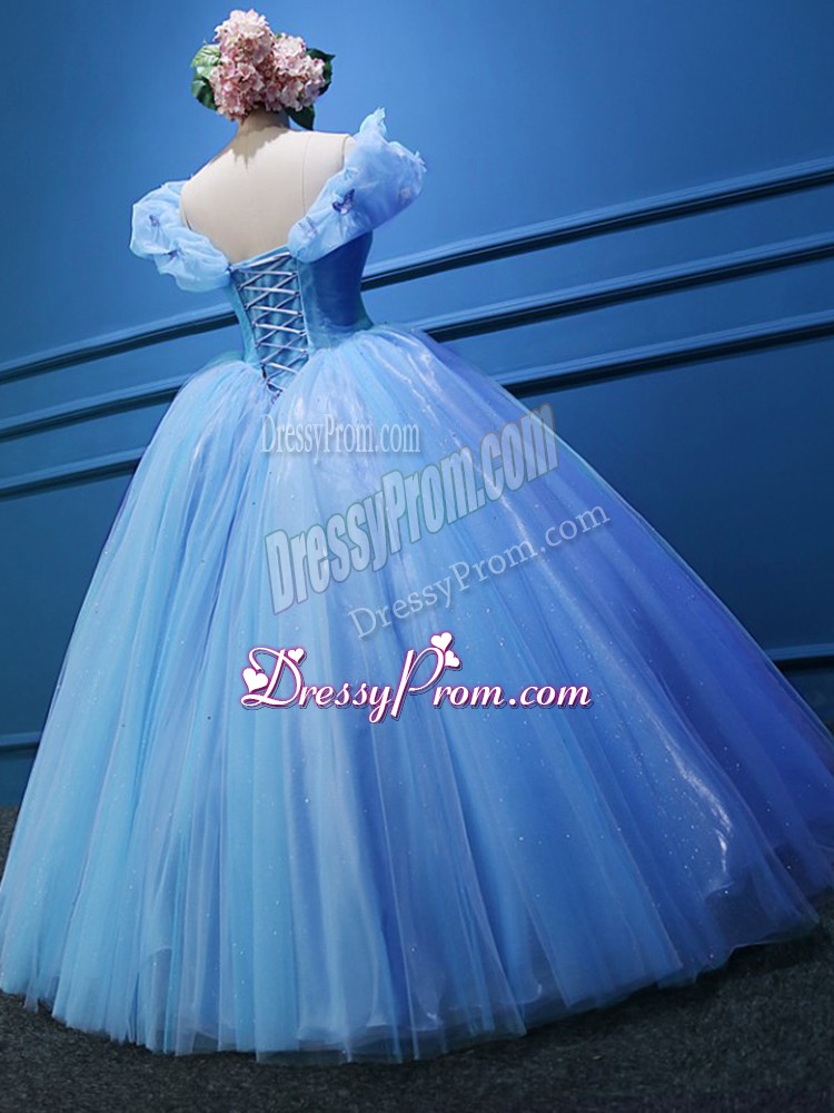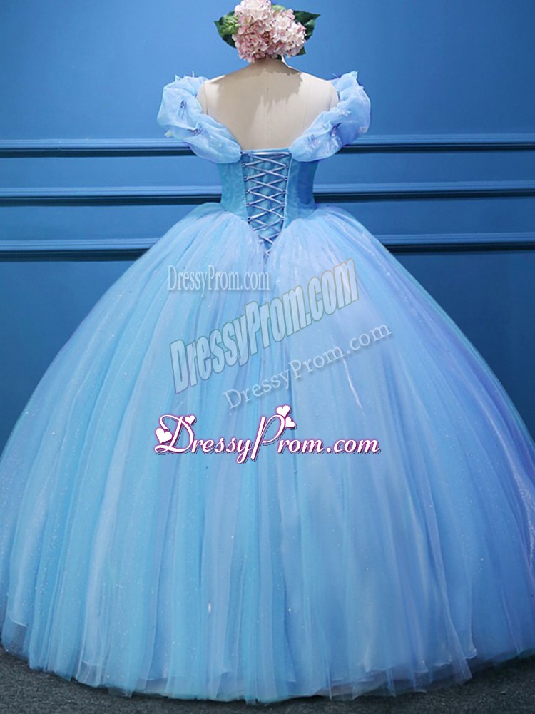 Neckline : Off the shoulderShown Color : Baby BlueSilhouette : Ball GownsSleeve Length : sleevelessHemline : floor lengthBack Detail : ZipperFabric : TulleEmbellishment : AppliquesOccasion : Military Ball,Sweet 16,QuinceaneraSeason : Spring,Summer,Fall,Winter
