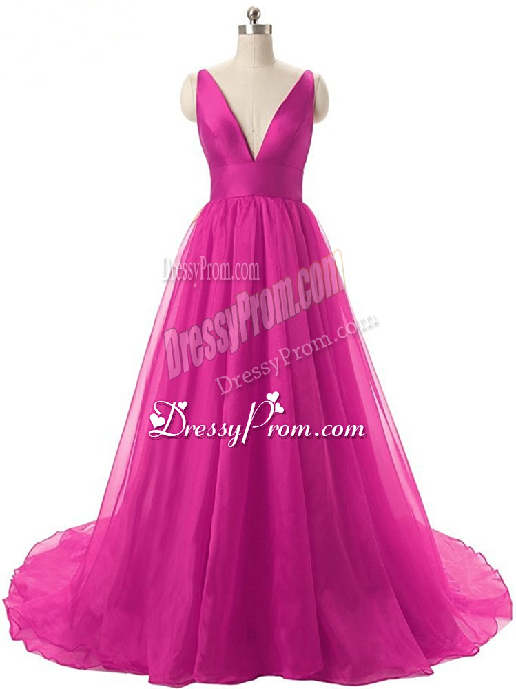 Neckline : V-neckShown Color : FuchsiaSilhouette : A-lineSleeve Length : sleevelessBack Detail : BacklessFabric : OrganzaEmbellishment : RuchingOccasion : Prom,Military BallSeason : Spring,Summer,Fall,Winter