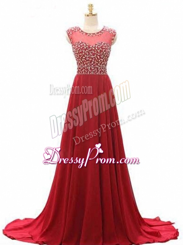 Neckline : ScoopShown Color : Wine RedSilhouette : EmpireSleeve Length : sleevelessBack Detail : Lace upFabric : ChiffonEmbellishment : BeadingOccasion : Prom,Military Ball,Sweet 16Season : Spring,Summer,Fall,Winter