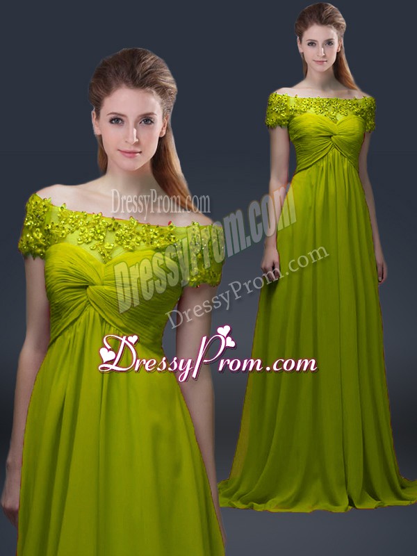 Hot Sale Olive Green A-line Off The Shoulder Short Sleeves Satin Floor Length Lace Up Appliques Evening Dress
