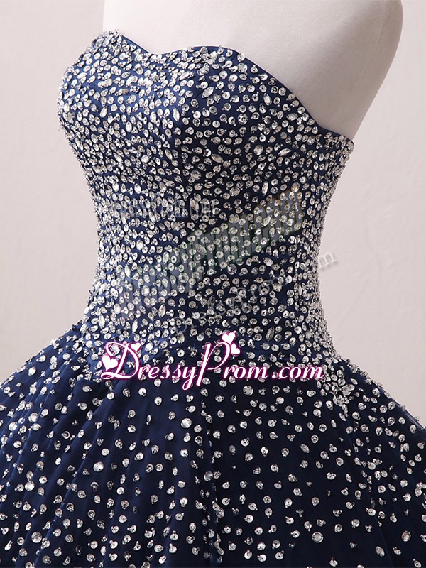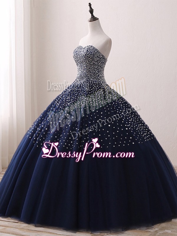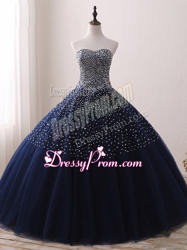 Neckline : SweetheartShown Color : Navy BlueSilhouette : Ball GownsSleeve Length : sleevelessHemline : floor lengthBack Detail : Lace upFabric : TulleEmbellishment : BeadingOccasion : Prom,Party,Military Ball,Sweet 16,QuinceaneraSeason : Spring,Summer,Fall,Winter