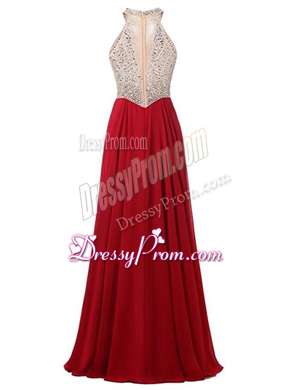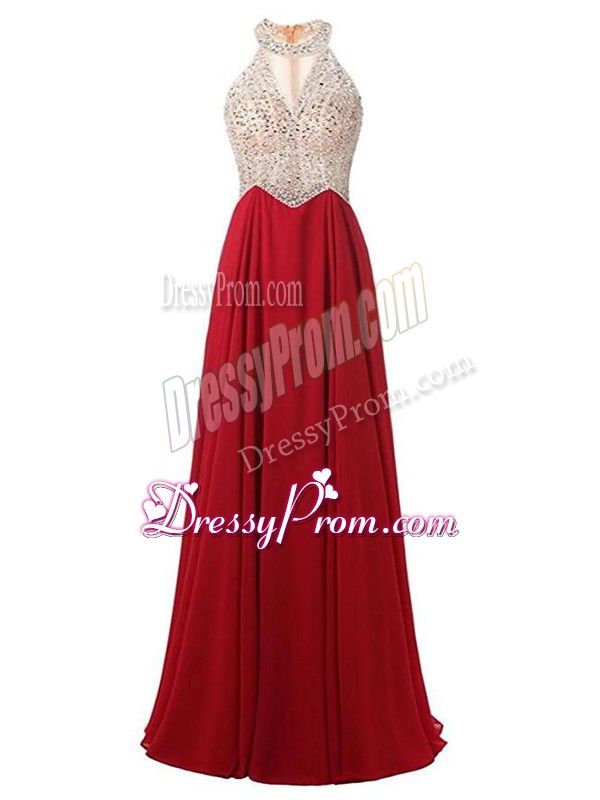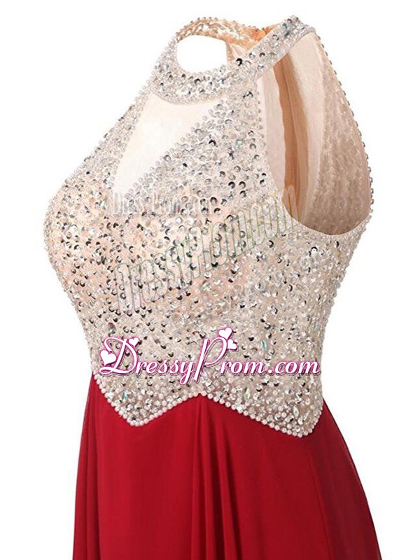 Neckline : High-neckShown Color : Wine RedSilhouette : EmpireSleeve Length : sleevelessHemline : floor lengthBack Detail : ZipperFabric : ChiffonEmbellishment : BeadingOccasion : Prom,Party,Military BallSeason : Spring,Summer,Fall,Winter
