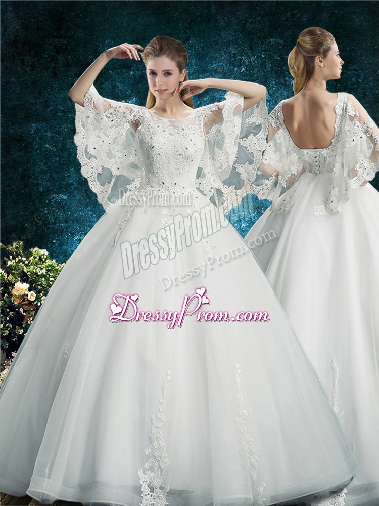 Neckline : ScoopShown Color : WhiteSilhouette : Ball GownsSleeve Length : half sleevesHemline : floor lengthBack Detail : Lace upFabric : TulleEmbellishment : LaceOccasion : Wedding PartySeason : Spring,Summer,Fall,Winter