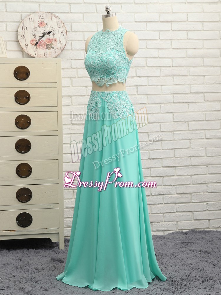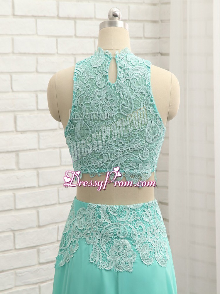Neckline : High-neckShown Color : Apple GreenSilhouette : Two PiecesSleeve Length : sleevelessHemline : floor lengthBack Detail : Side zipperFabric : ChiffonEmbellishment : AppliquesOccasion : Prom,Party,Military BallSeason : Spring,Summer,Fall,Winter