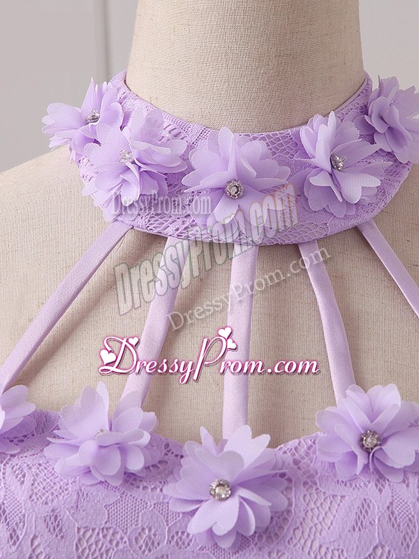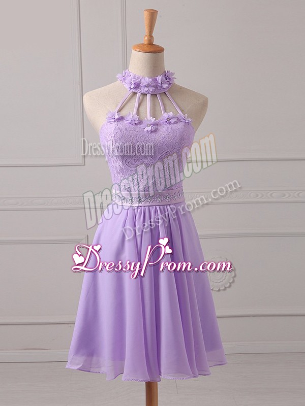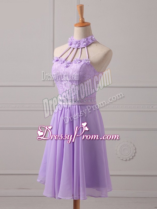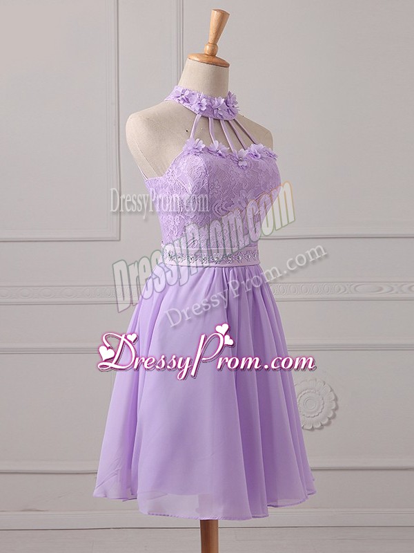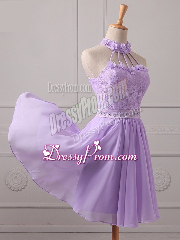 Neckline : Halter topShown Color : LavenderSilhouette : A-lineSleeve Length : sleevelessHemline : mini lengthBack Detail : Lace upFabric : ChiffonEmbellishment : Lace,AppliquesOccasion : Prom,Party,Wedding PartySeason : Spring,Summer,Fall