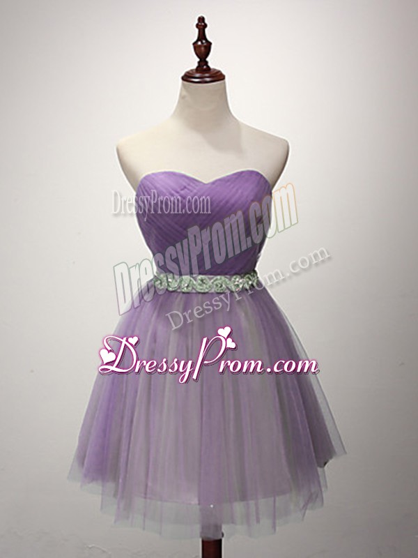 Neckline : SweetheartShown Color : LavenderSilhouette : A-lineSleeve Length : sleevelessHemline : mini lengthBack Detail : Lace upFabric : TulleEmbellishment : RuchingOccasion : Prom,Party,Military Ball,Sweet 16Season : Spring,Summer,Fall