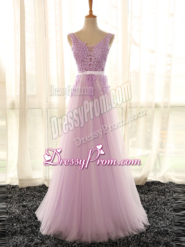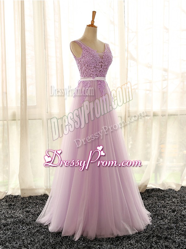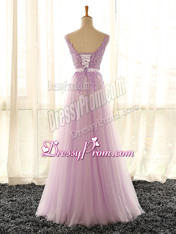 Neckline : V-neckShown Color : LilacSilhouette : A-lineSleeve Length : sleevelessHemline : floor lengthBack Detail : Lace upFabric : TulleEmbellishment : AppliquesOccasion : Prom,Party,Wedding PartySeason : Spring,Summer,Fall,Winter