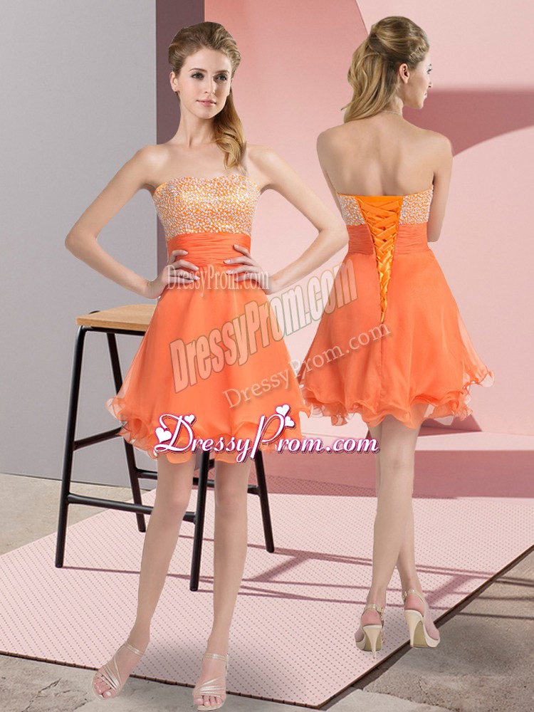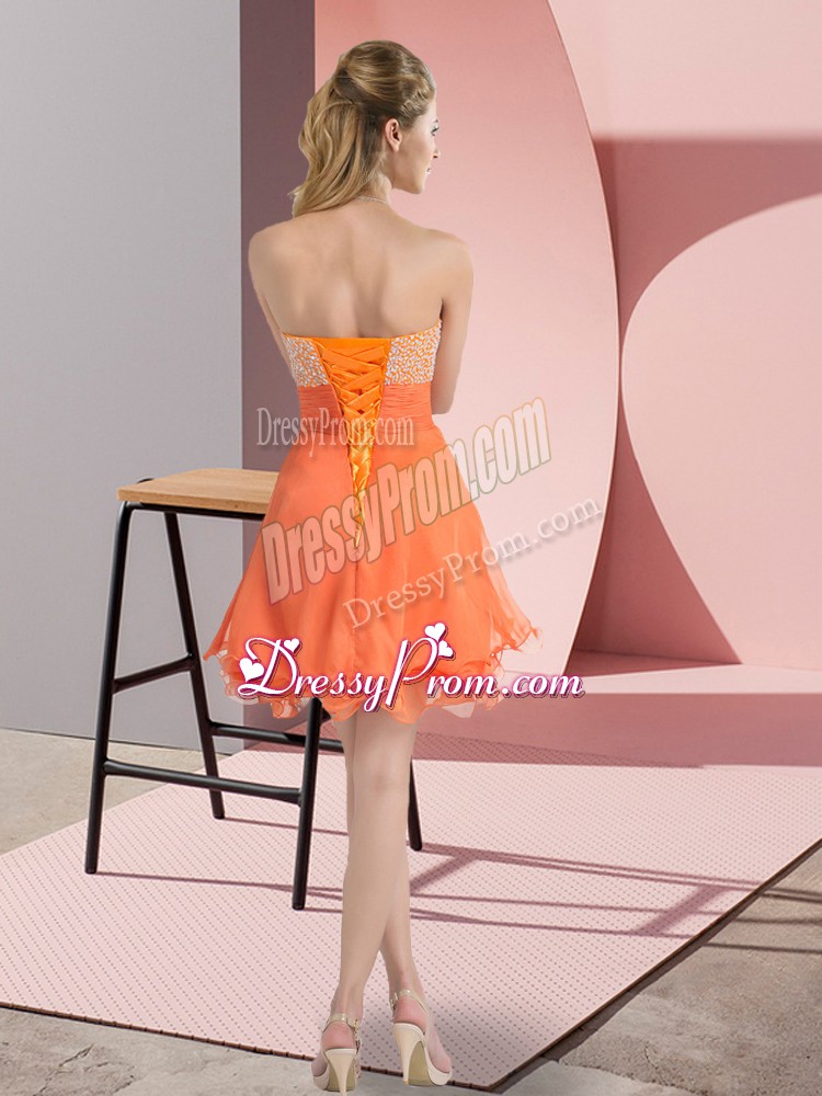 Neckline : SweetheartShown Color : OrangeSilhouette : A-lineSleeve Length : sleevelessHemline : mini lengthBack Detail : Lace upFabric : ChiffonEmbellishment : BeadingOccasion : Prom,Party,Sweet 16Season : Spring,Summer,Fall