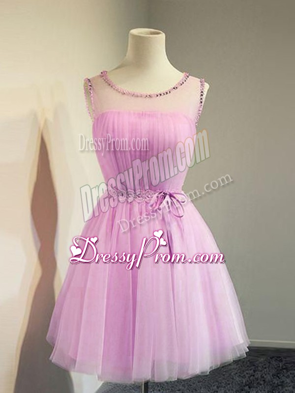 Neckline : ScoopShown Color : LilacSilhouette : EmpireSleeve Length : sleevelessHemline : knee lengthBack Detail : Lace upFabric : TulleEmbellishment : BeltOccasion : Prom,Party,Wedding PartySeason : Spring,Summer,Fall