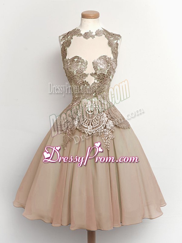 Neckline : High-neckShown Color : BrownSilhouette : A-lineSleeve Length : sleevelessHemline : knee lengthBack Detail : Lace upFabric : ChiffonEmbellishment : LaceOccasion : Prom,Party,Wedding PartySeason : Spring,Summer,Fall