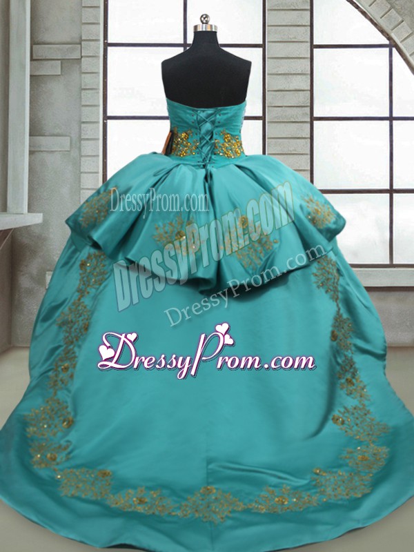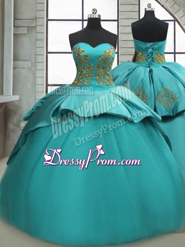 Neckline : SweetheartShown Color : TurquoiseSilhouette : Ball GownsSleeve Length : sleevelessBack Detail : Lace upFabric : SatinEmbellishment : Beading,AppliquesOccasion : Military Ball,Sweet 16,QuinceaneraSeason : Spring,Summer,Fall,Winter