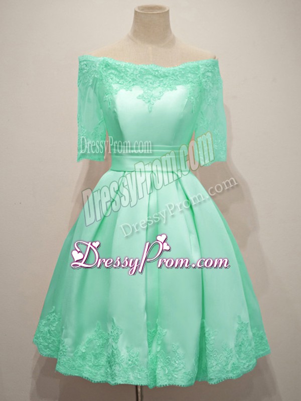 Neckline : Off the shoulderShown Color : TurquoiseSilhouette : A-lineSleeve Length : half sleevesHemline : knee lengthBack Detail : Lace upFabric : TaffetaEmbellishment : LaceOccasion : Prom,Party,Wedding PartySeason : Spring,Summer,Fall