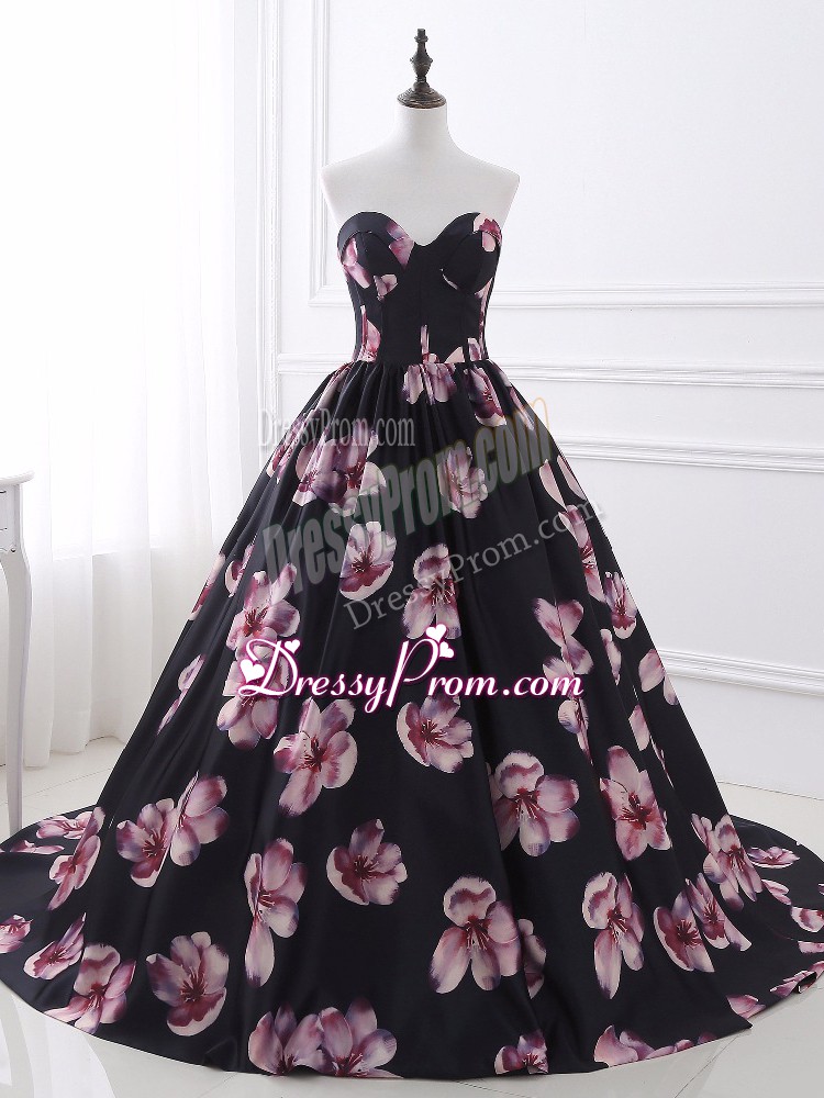Neckline : SweetheartShown Color : Multi-colorSilhouette : Ball GownsSleeve Length : sleevelessBack Detail : Lace upFabric : PrintedEmbellishment : RuchingOccasion : Prom,Military Ball,Sweet 16Season : Spring,Summer,Fall,Winter