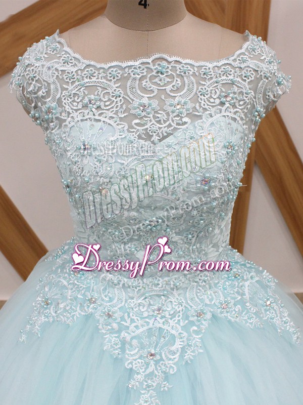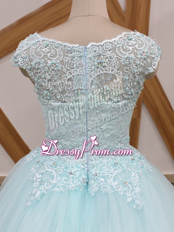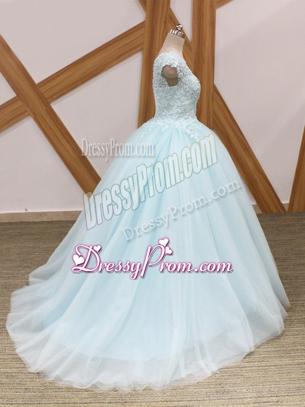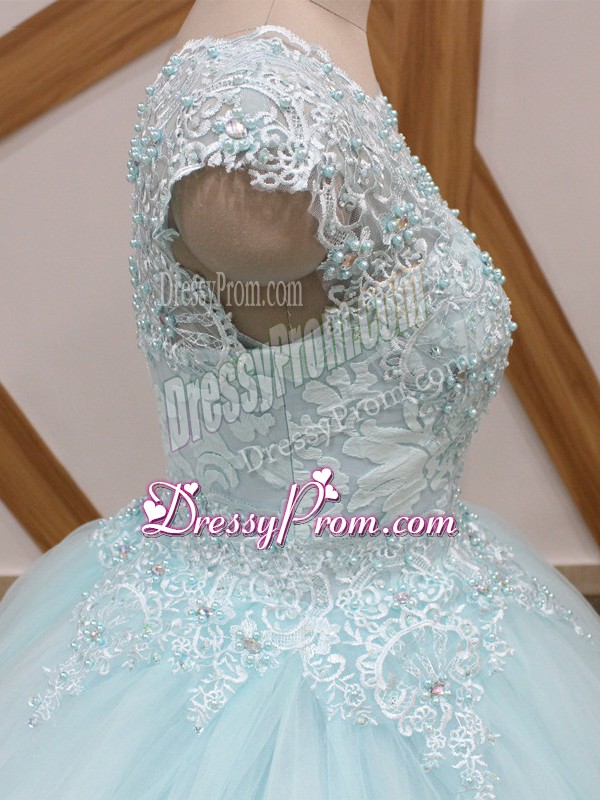 Neckline : ScoopShown Color : Light BlueSilhouette : Ball GownsSleeve Length : sleevelessBack Detail : ZipperFabric : TulleEmbellishment : Beading,LaceOccasion : Military Ball,Sweet 16,QuinceaneraSeason : Spring,Summer,Fall,Winter