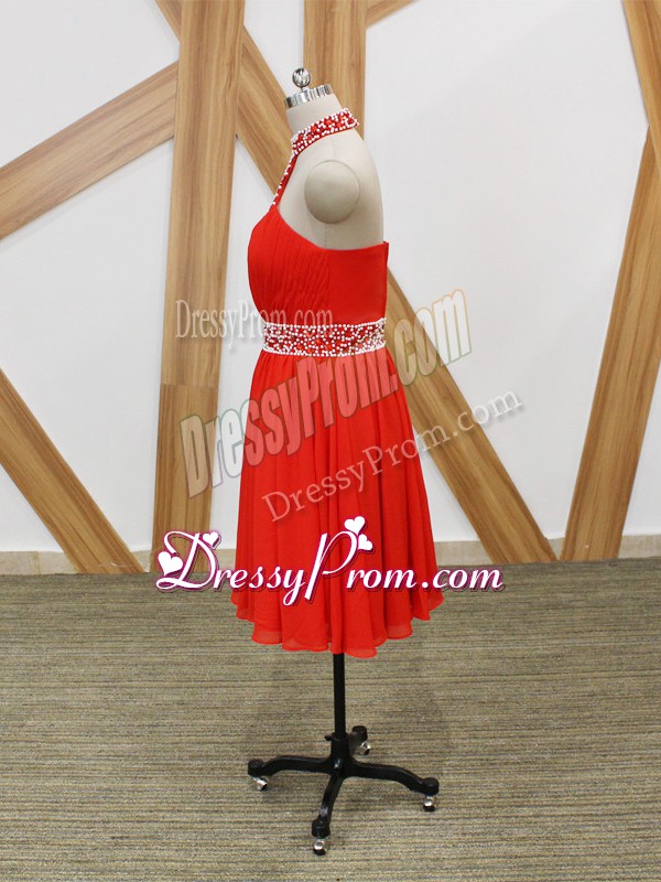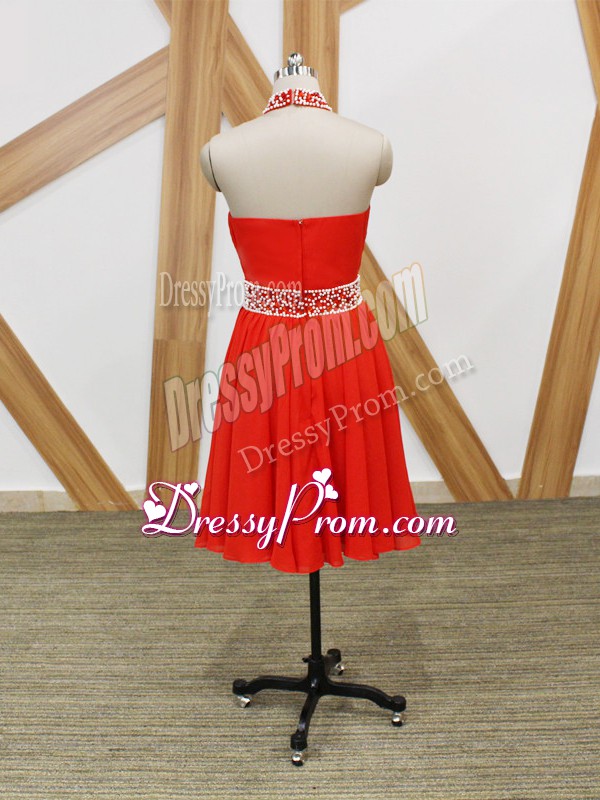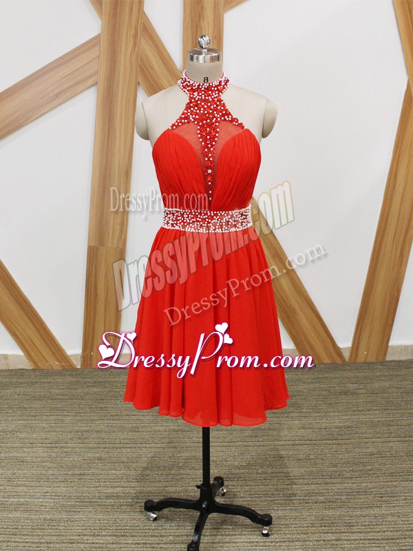 Neckline : Halter topShown Color : Coral RedSilhouette : EmpireSleeve Length : sleevelessBack Detail : ZipperFabric : ChiffonEmbellishment : Beading,RuchingOccasion : Prom,Party,Sweet 16Season : Spring,Summer,Fall